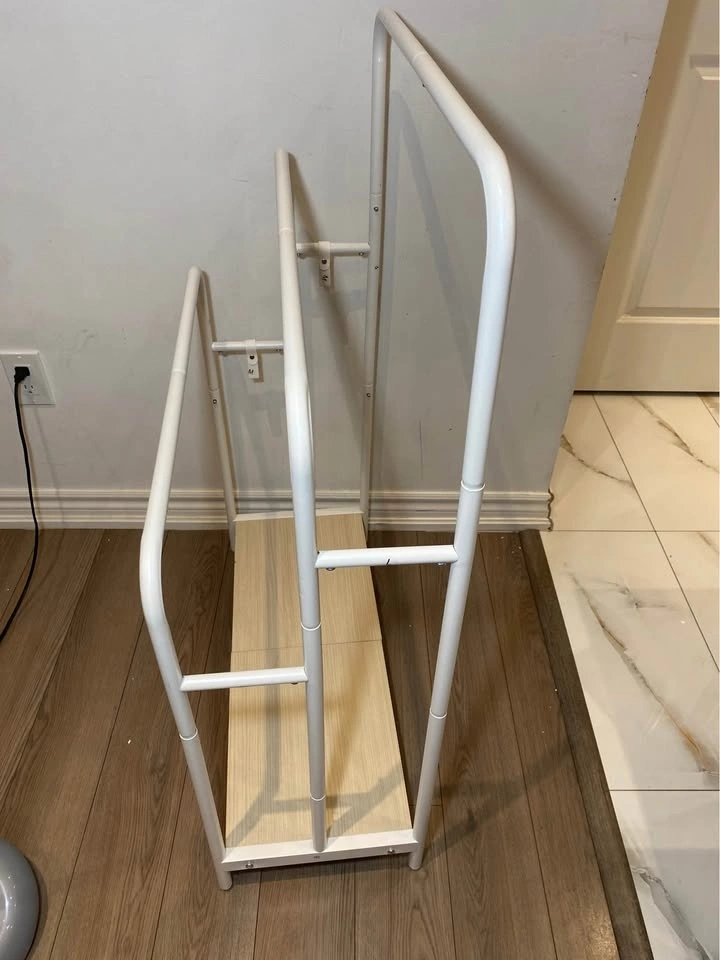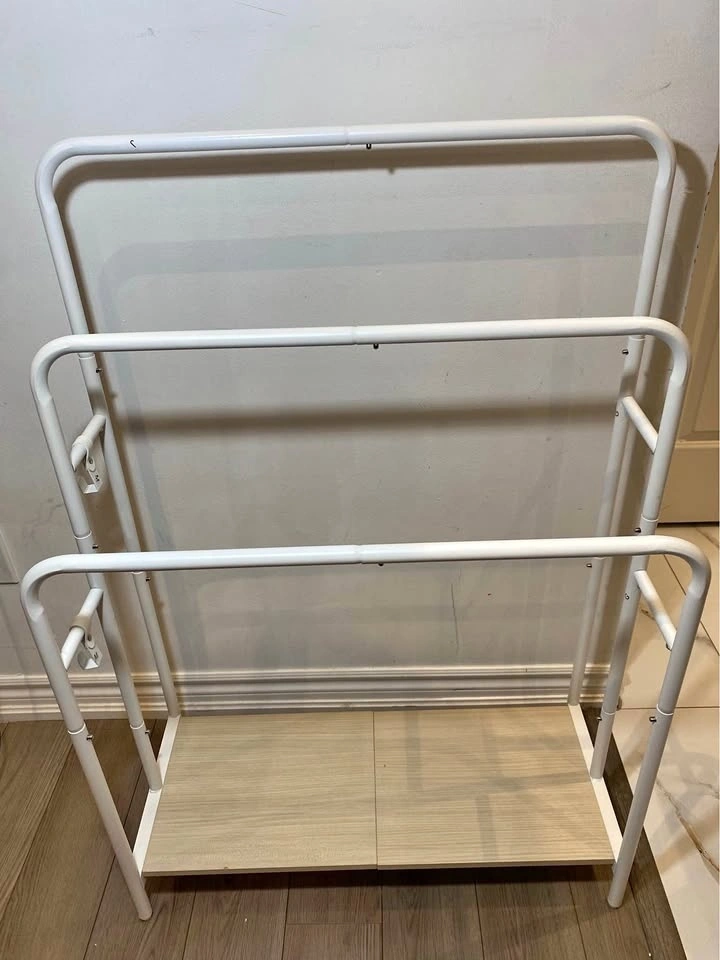 Clean VASAGLE 3-tier blanket rack. Freestanding design with white metal frame and natural beige wood storage shelf. Good for blankets, throws, towels, or clothes. Measures 27.6" W x 11.8" D x 39.4" H. Pick up near Brock Road and Rex Heath Drive in Pickering.