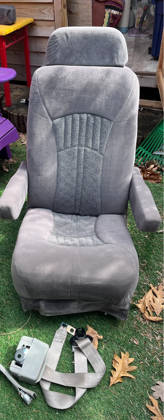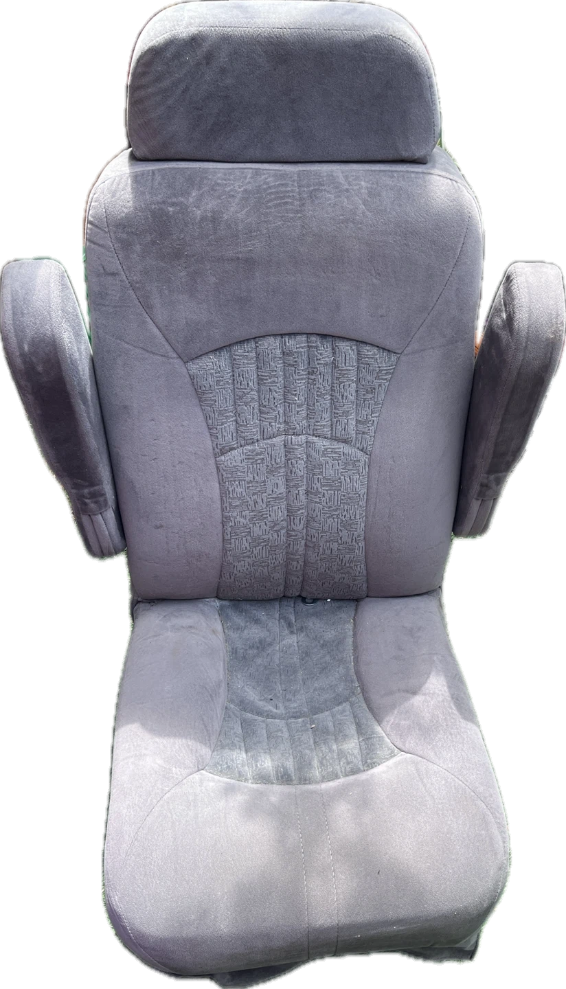 Grey fabric captain's chair featuring a headrest and adjustable armrests. Includes seatbelt assembly. This chair provides comfortable seating, suitable for vans or RVs.
