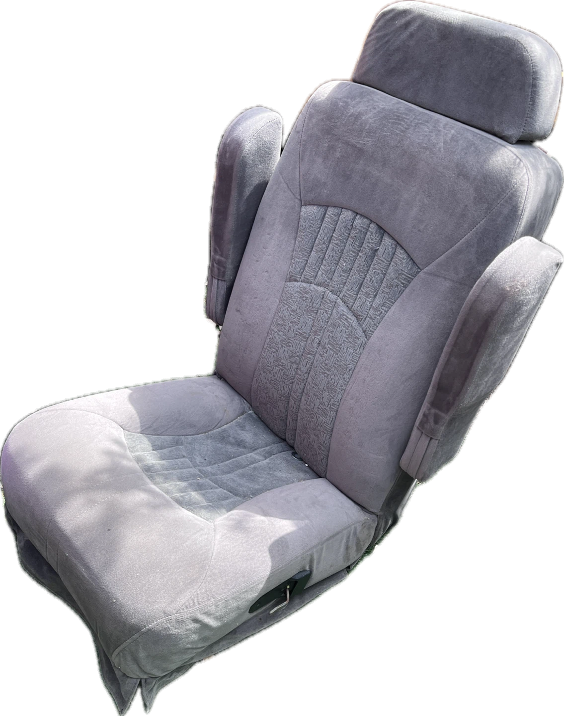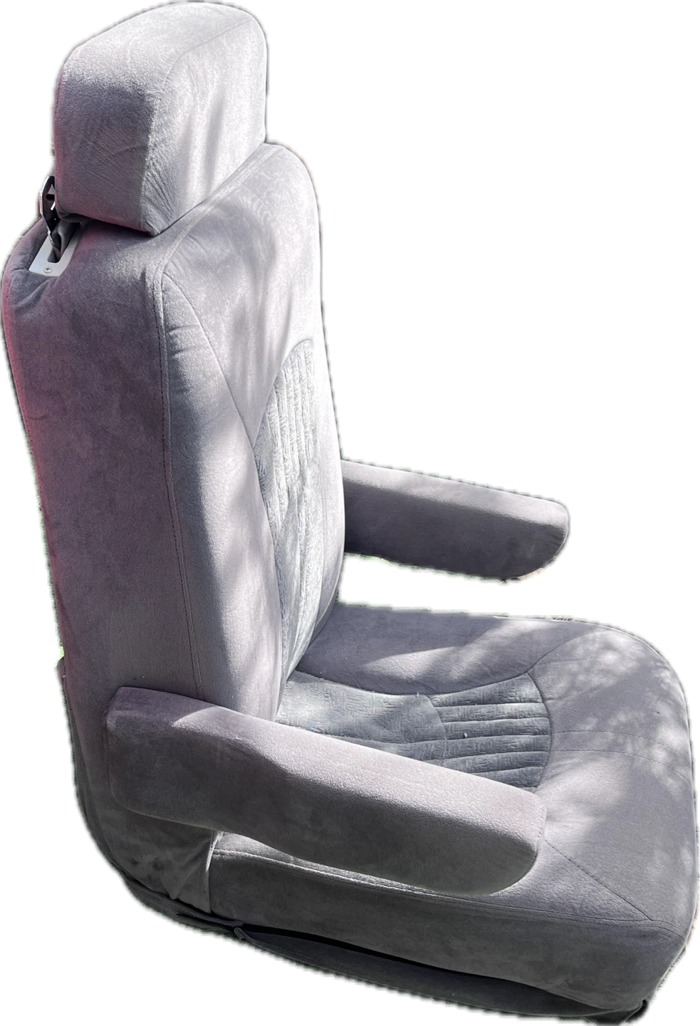 Grey fabric captain's chair featuring a headrest and adjustable armrests. Includes seatbelt assembly. This chair provides comfortable seating, suitable for vans or RVs.