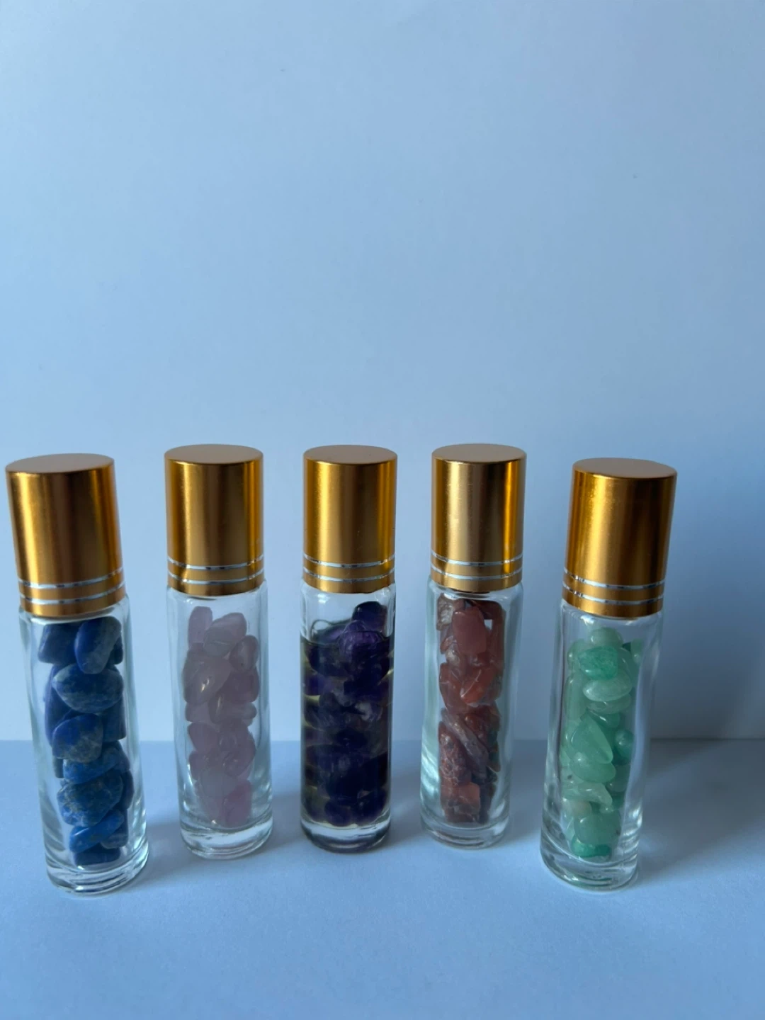 Set of five crystal rollerballs, perfect for aromatherapy! Each rollerball is filled with different crystals: lapis lazuli, rose quartz, amethyst, red jasper, and green aventurine. Add your favourite essential oils and enjoy the benefits of both aromatherapy and crystal healing