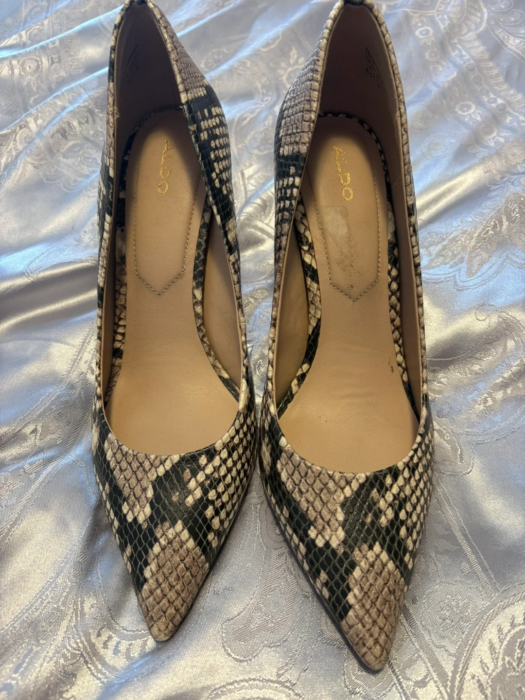 Stylish ALDO women's heels with a snake print pattern. These heels feature a pointed toe and a classic pump silhouette. A great addition to any wardrobe!