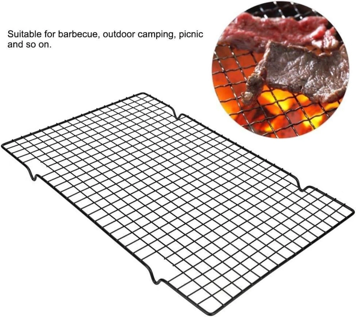 This is a black metal grilling rack. It's suitable for barbecue, outdoor camping, and picnics. The wire mesh design provides even heat distribution for your food.