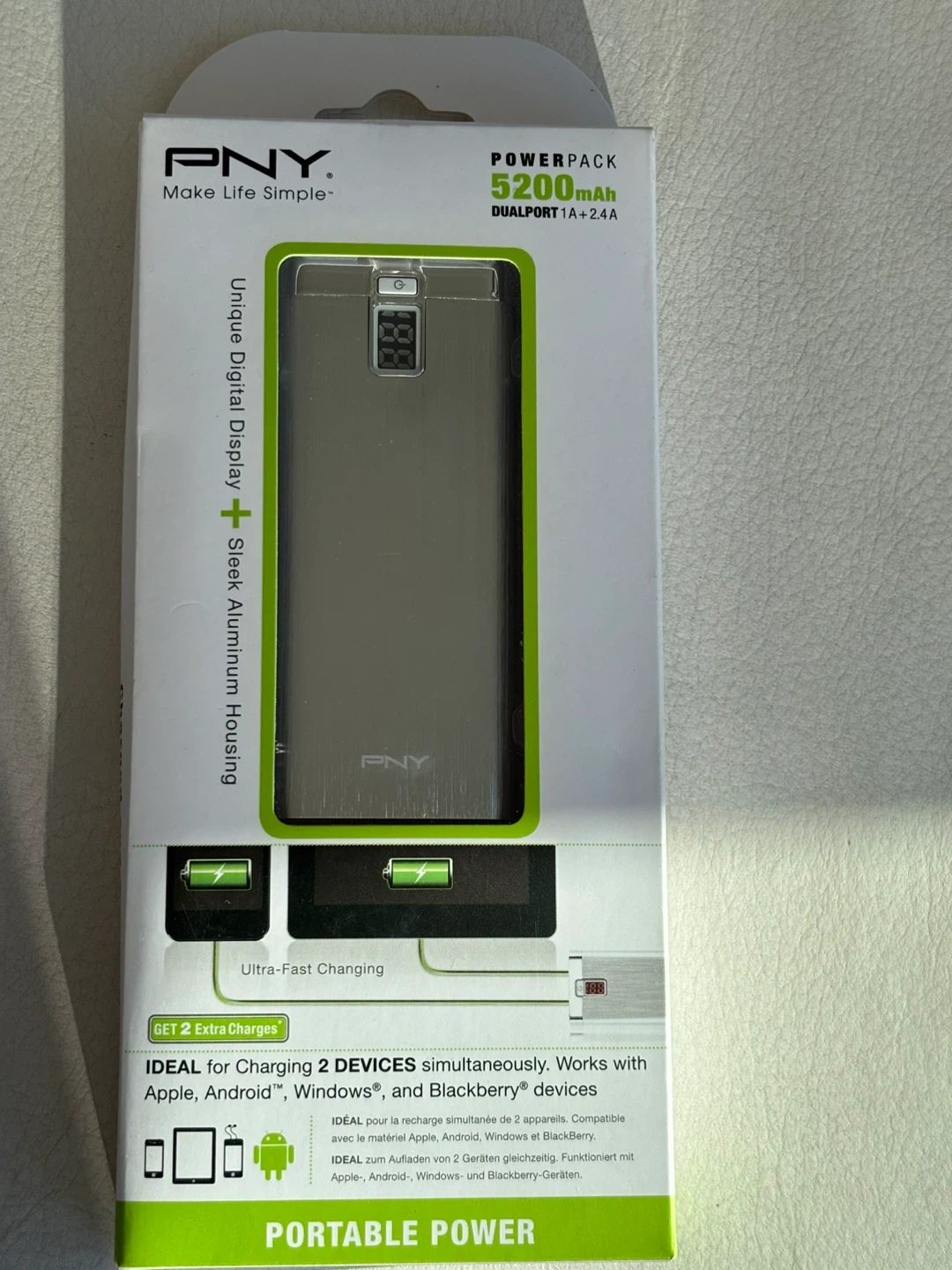 29Selling a brand new PNY Powerpack with 5200mAh capacity. It's ideal for charging two devices simultaneously and works with Apple, Android, Windows, and Blackberry devices. The power bank features a unique digital display and a sleek aluminum housing for a modern look. It also has ultra-fast charging capabilities. Get 2 extra charges with this portable power solution! Pick up North Burnaby Thank-you.