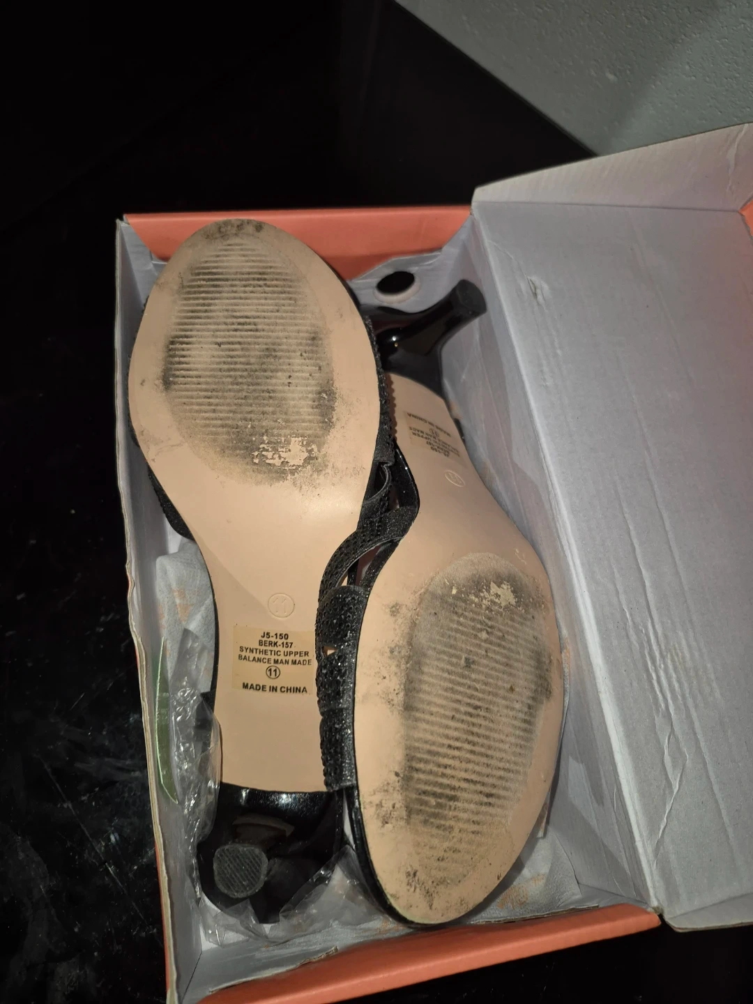 These black sparkle heels from De Blossom Collection come in a size 11. They have a strappy design and a kitten heel. The original box is included. Worn to a couple events and have been stored in box in my closet.