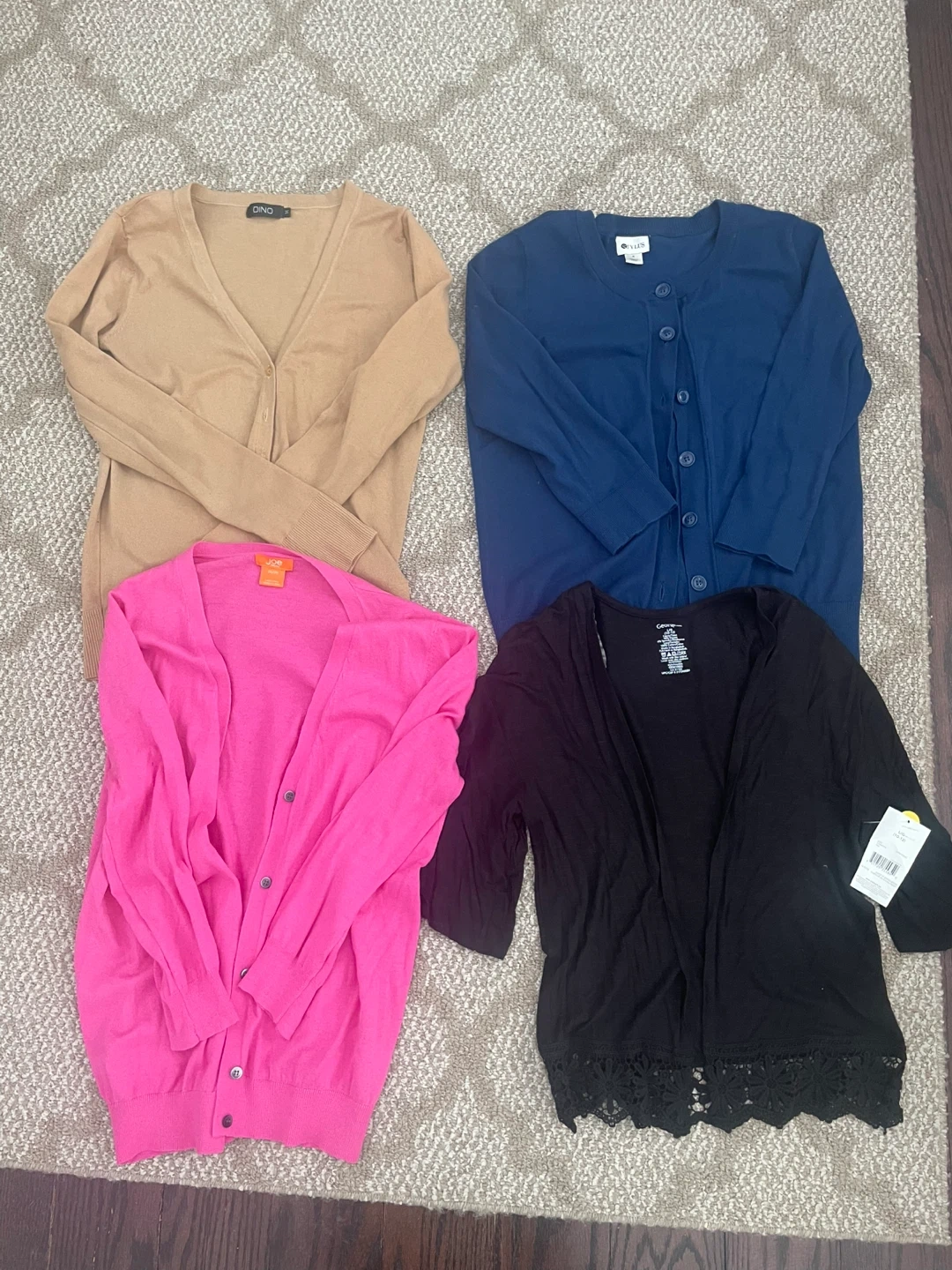 Four cardigans in various colours. Includes a tan V-neck, a blue button-up, a bright pink button-up, and a black lace-trim cropped cardigan. Great for layering!