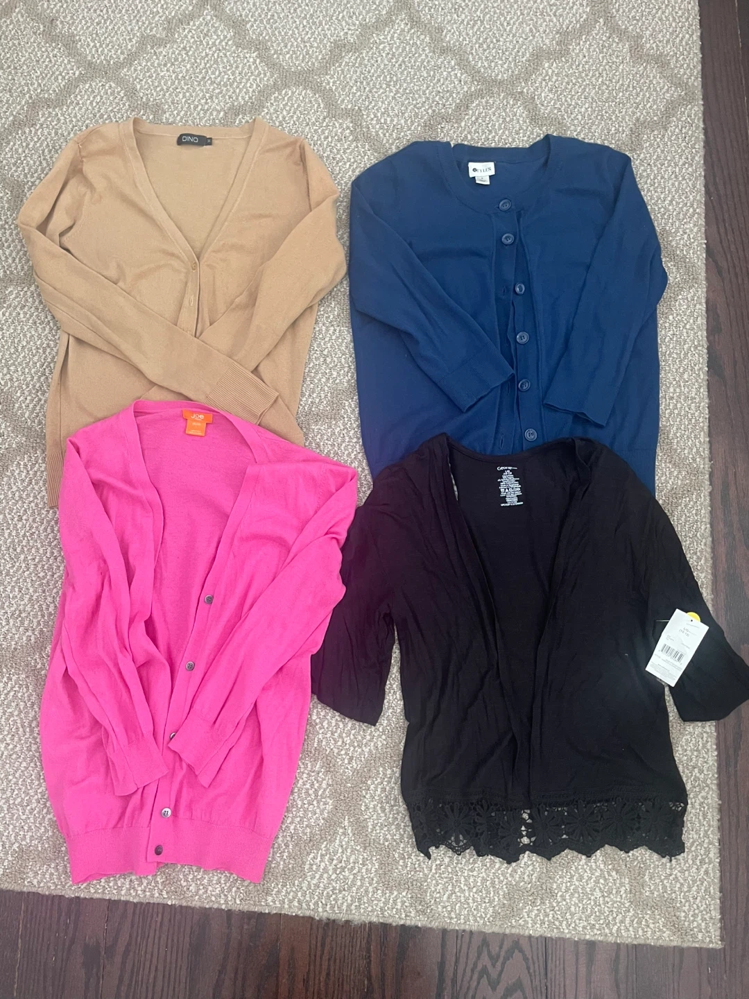 Four cardigans in various colours. Includes a tan V-neck, a blue button-up, a bright pink button-up, and a black lace-trim cropped cardigan. Great for layering!