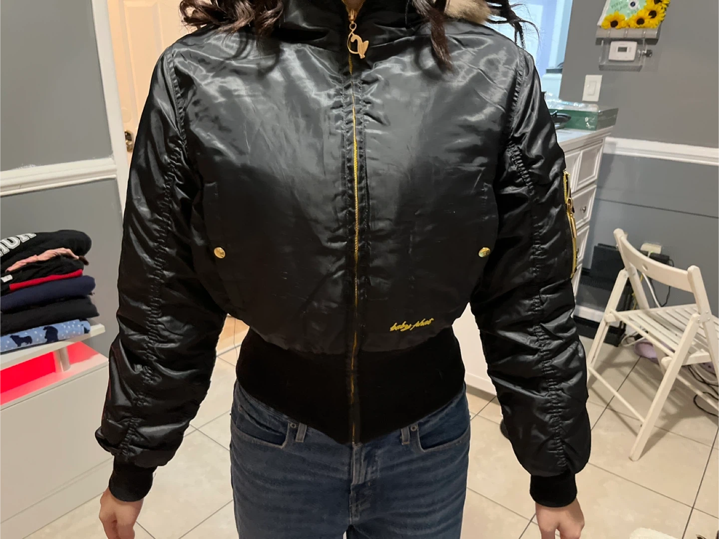 Black "BABY PHAT" Bomber Jacket with Fur Hood