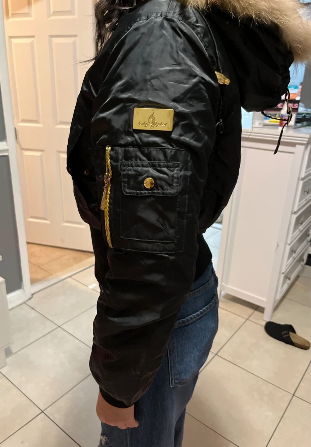 This is a black bomber jacket by Lady Alouette. It features a detachable fur-lined hood and gold zipper accents. The jacket has a front zipper closure and ribbed cuffs and hem.