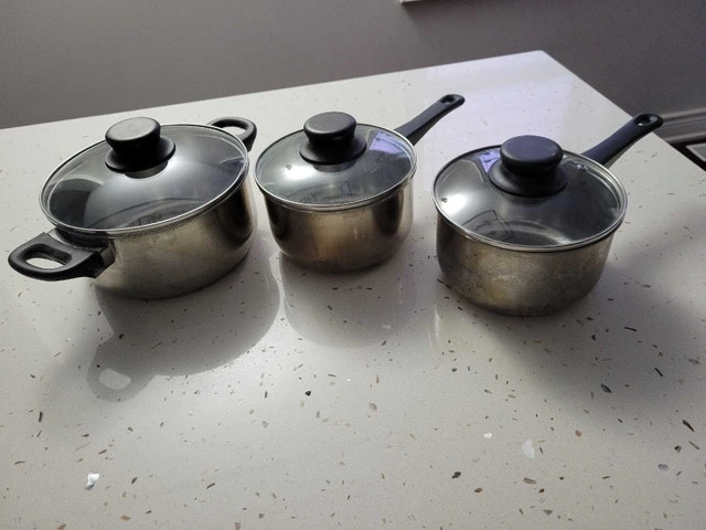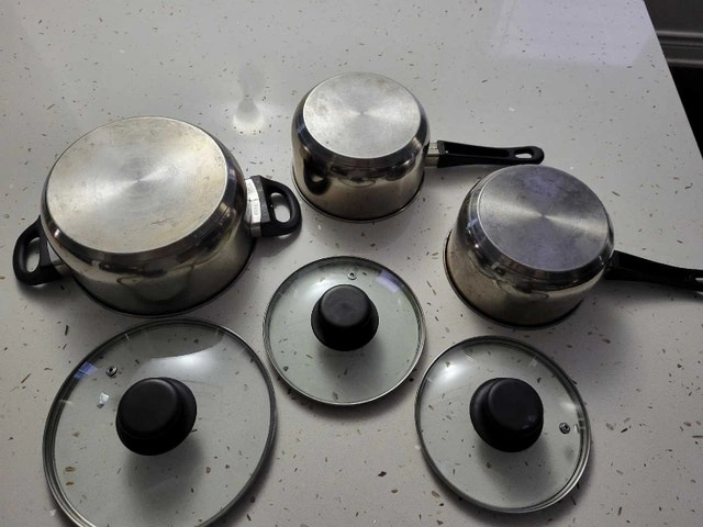 This is a set of three pots with lids, perfect for any kitchen! These pots are used but still in good condition, ready for their next culinary adventure. Includes three pots with matching lids in various sizes for different cooking needs. They're looking for a new home and someone to cook up a storm with them! If the ad is up, they're available, so don't hesitate to reach out! I'm pricing these at $25, which I believe is fair given Kijiji's median price of about $30 for similar items. Cash accepted.