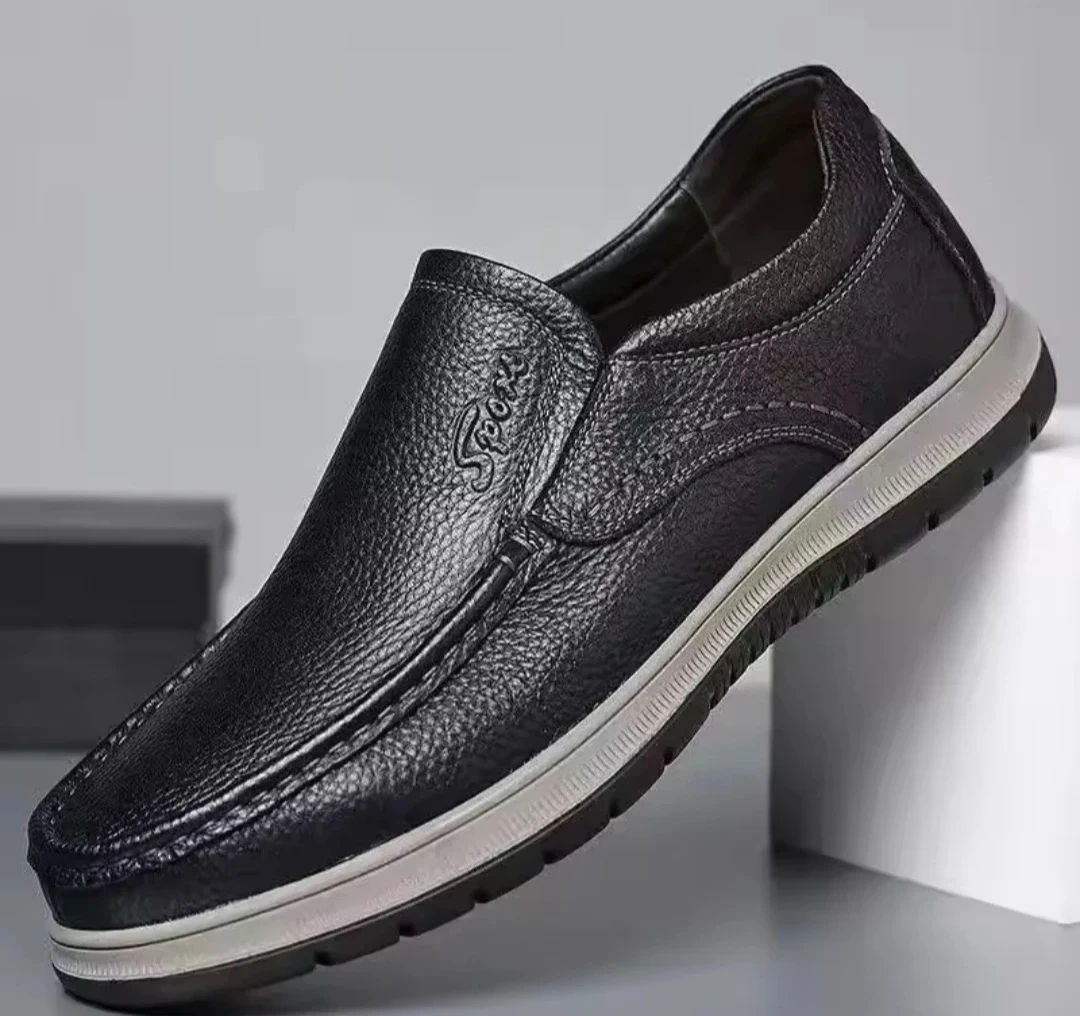 These black leather loafer shoes feature a "Sport" logo embossed on the side. They're made with a textured leather upper and a durable sole. This style of shoe is commonly worn for casual outings.