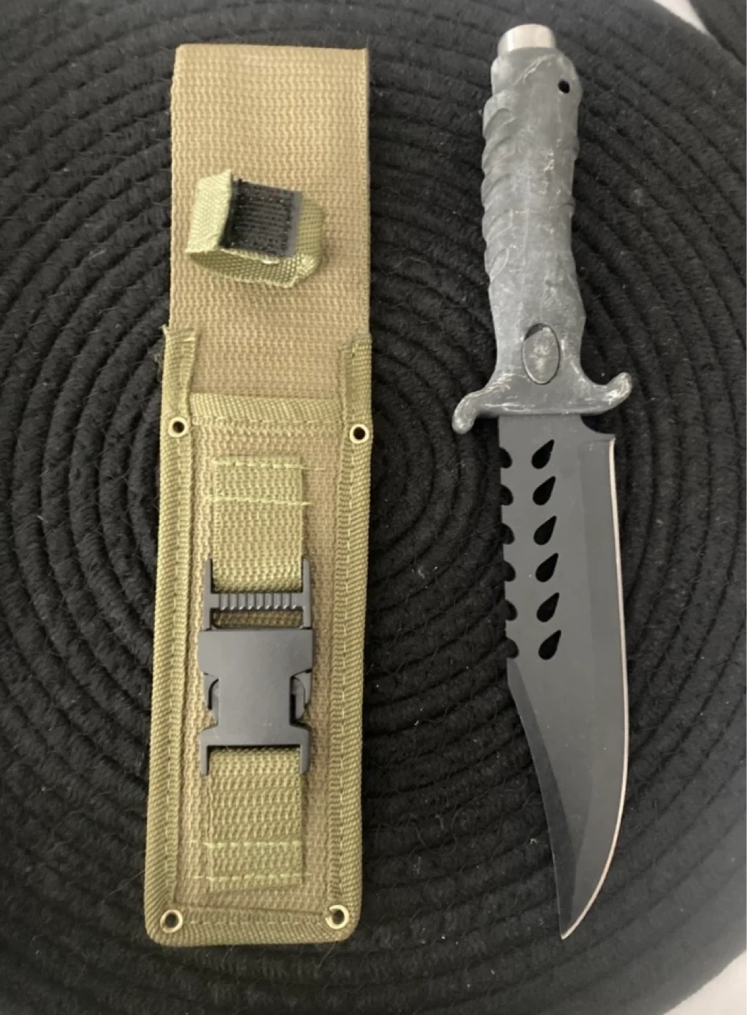 This is a brand new h u n t i n g k n i f e with a black blade and a green handle. It comes with a matching green sheath. It would be perfect for h u n t i n g, camping, or other outdoor activities. Please note, since the ad is still posted, it's available for purchase! $30 Cash only . No delivery . Must be 19 or over of age to sell to.
