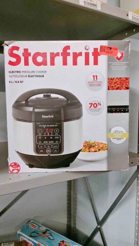 Versatile Starfrit electric pressure cooker with 8L / 8.5QT capacity. Features 11 preset cooking functions, saving up to 70% cooking time. Includes quick and healthy recipes. Still in box, never opened.