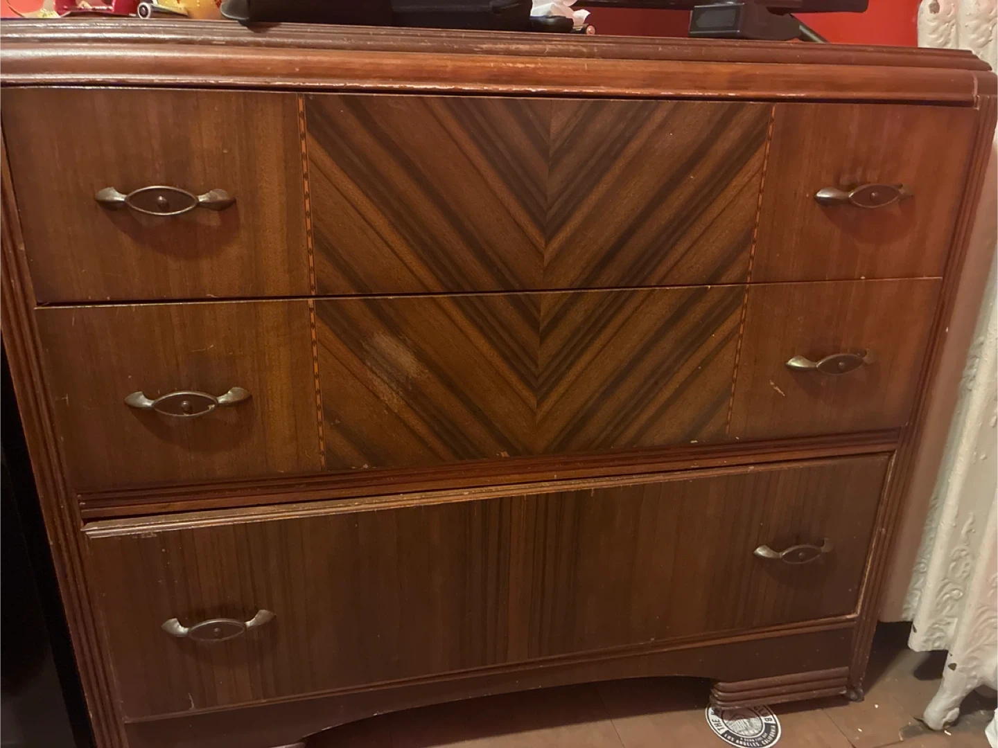 Buy & SellVintage Wood DresserVintage Wood Dresser$100This is a vintage wooden dresser with a unique chevron pattern on the drawer fronts. It has three drawers for storage. Wood material.WHERE TO MEETCheck LocationView MapSELLERReneKingsbridge181 review1 chats·1 favorites·164 viewsSEND CHAT TO SELLERHi Rene! I’m interested in your listing.Hi Rene! I’m interested in your listing.Get the Karrot app to chatSign In to chat