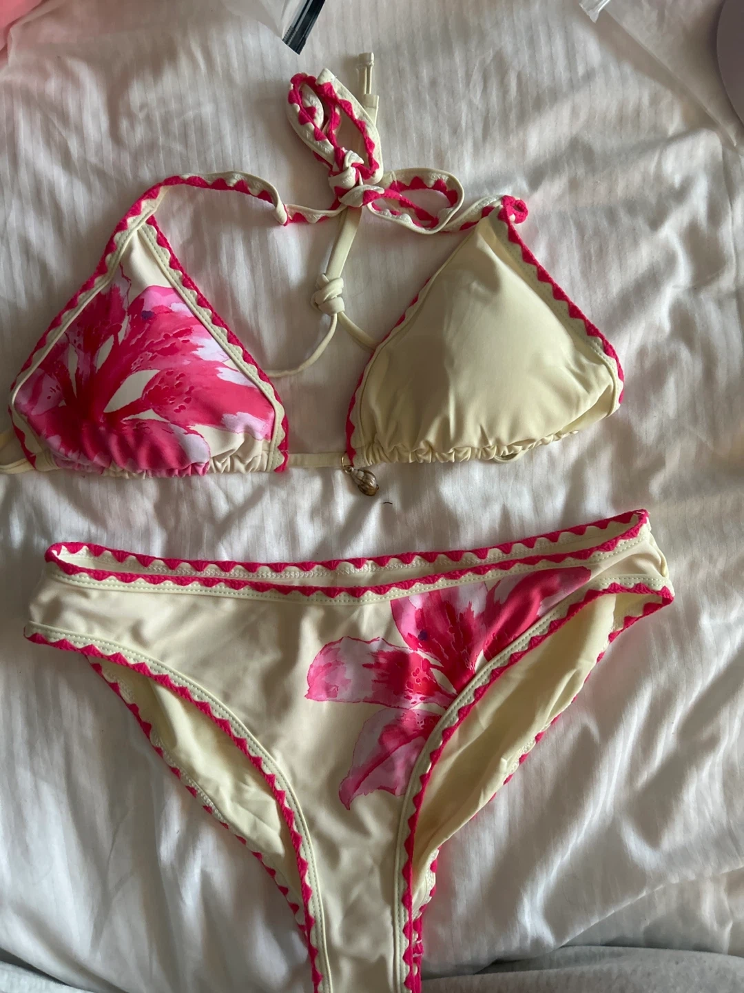 Brand new, never been worn. A lovely bikini set with a floral print. Features a cream base with bright pink floral accents and trim. Perfect for your next beach vacation!