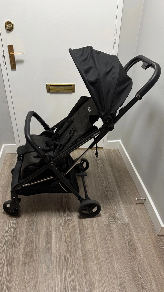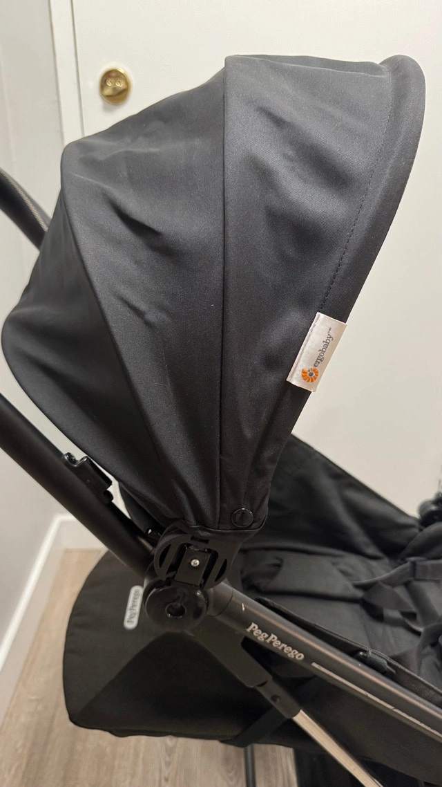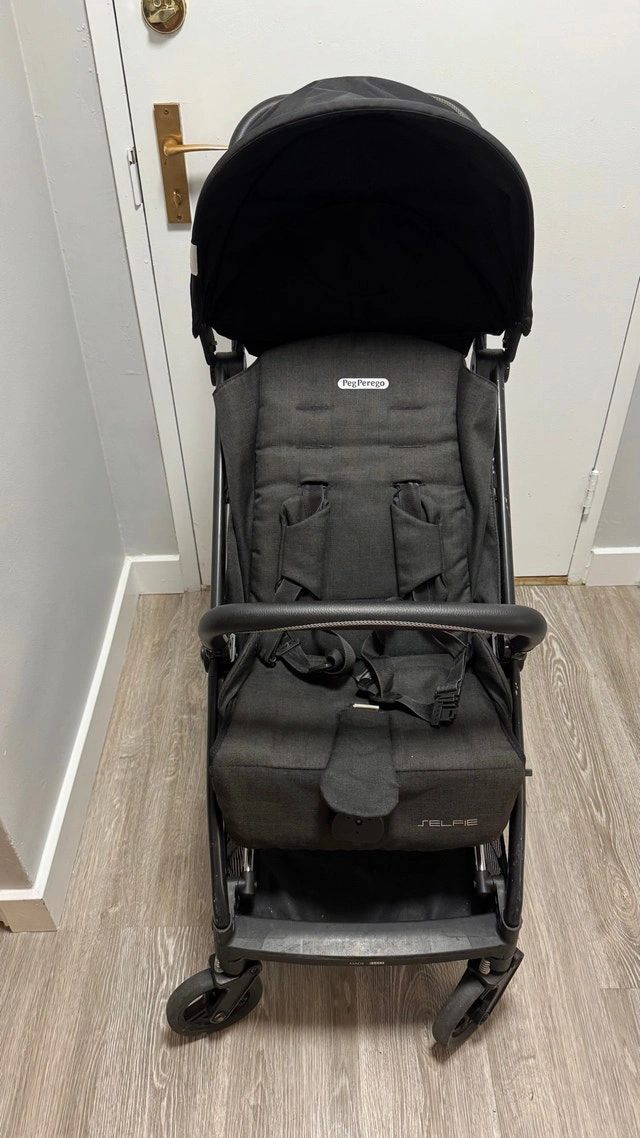 In like-new condition. The original roof canopy was damaged and replaced with a new Ergobaby canopy (UPF 50+). Because it's a different brand, there is a small gap when the seat is fully reclined. This is an easy fix for a tailor, but I haven’t had the time to manage it since we have another travel stroller. I have reduced the price to 1/3 of the original cost to reflect this. It’s a perfect lightweight travel stroller with great suspension! Clean Peg Perego Selfie stroller. Black color. Super easy to fold and lightweight. Great for travel or everyday use. Suitable up to 48 lbs. Stroller Weight: 14 lbs. Stroller Basket Weight Limit: 10 lbs. Wheels Diameter: 14 cm - 17 cm. Size of unfolded item: 51.5 W x 106.5 H x 89 D (cm). Size of folded item: 51.5 W x 62 H x 41 D (cm). Made in Italy. Folds on its own, automatically and compactly. One-handed backrest recline with a near-flat position. Easy drive system featuring ball bearing wheels with suspension. The eco-leather handlebar can be steered with just one hand! Solid, lightweight aluminum frame. Includes a convenient carry-all basket. Large UPF 50+ hood canopy with zip fastening. Featured an adjustable 5-point harness. Large, ultra-comfortable seat. When folded, the stroller can be used as a carry handle. Removable open-close front bar in eco-leather. Make it a Travel System with the adapter [sold separately] for any Peg Perego car seat.