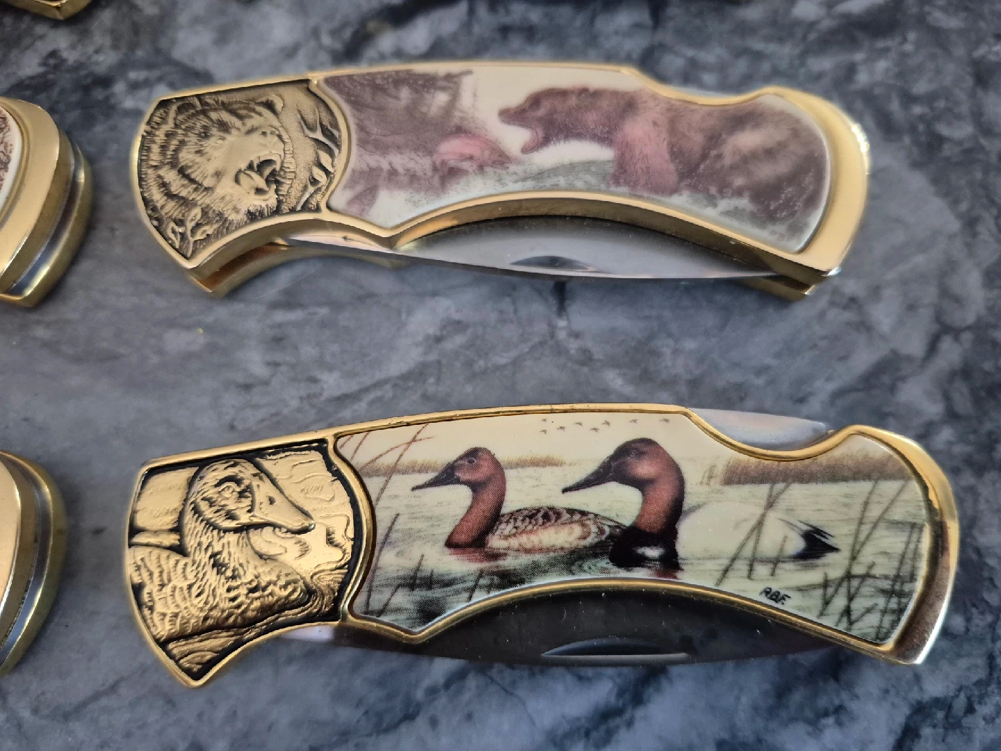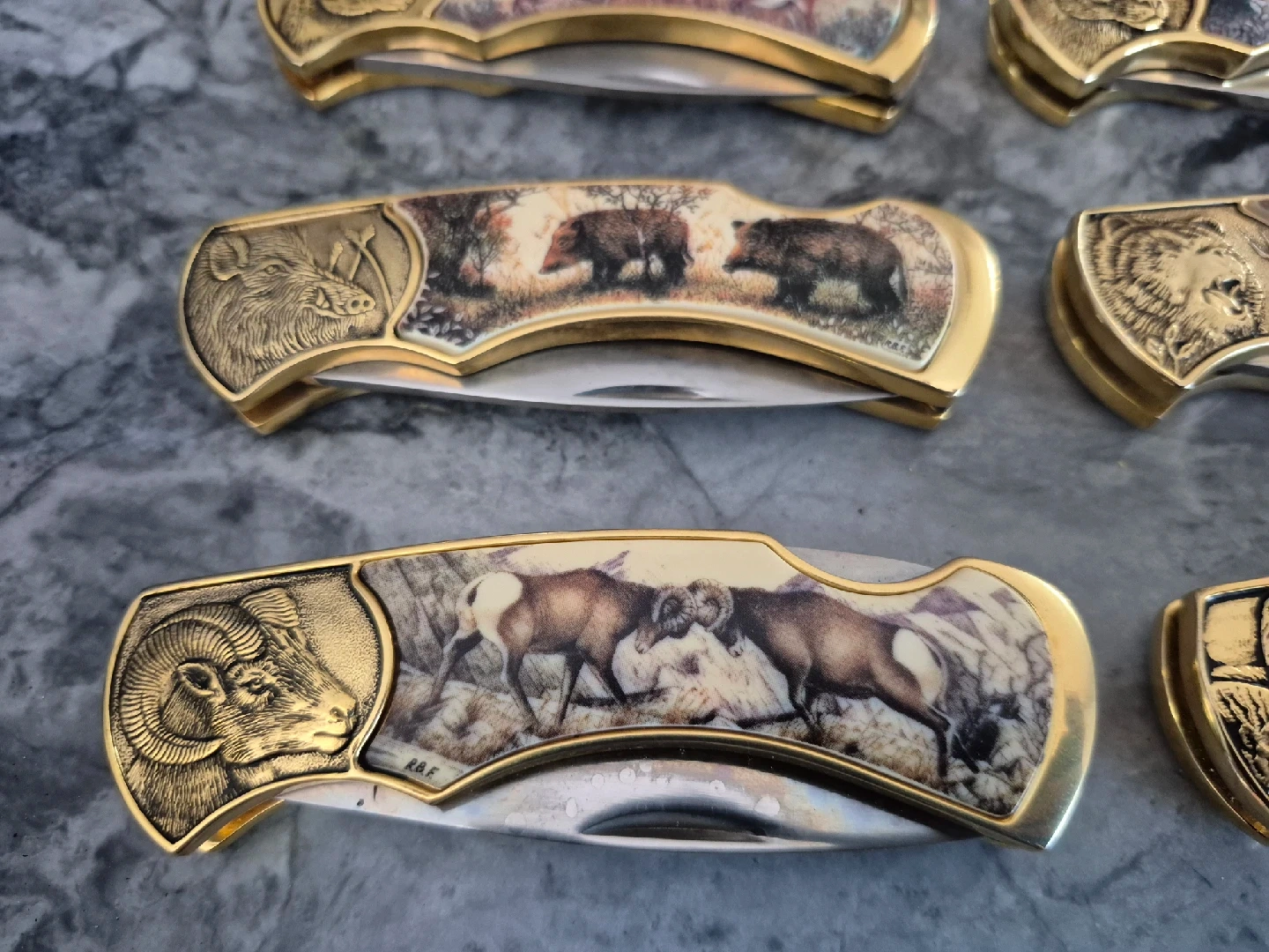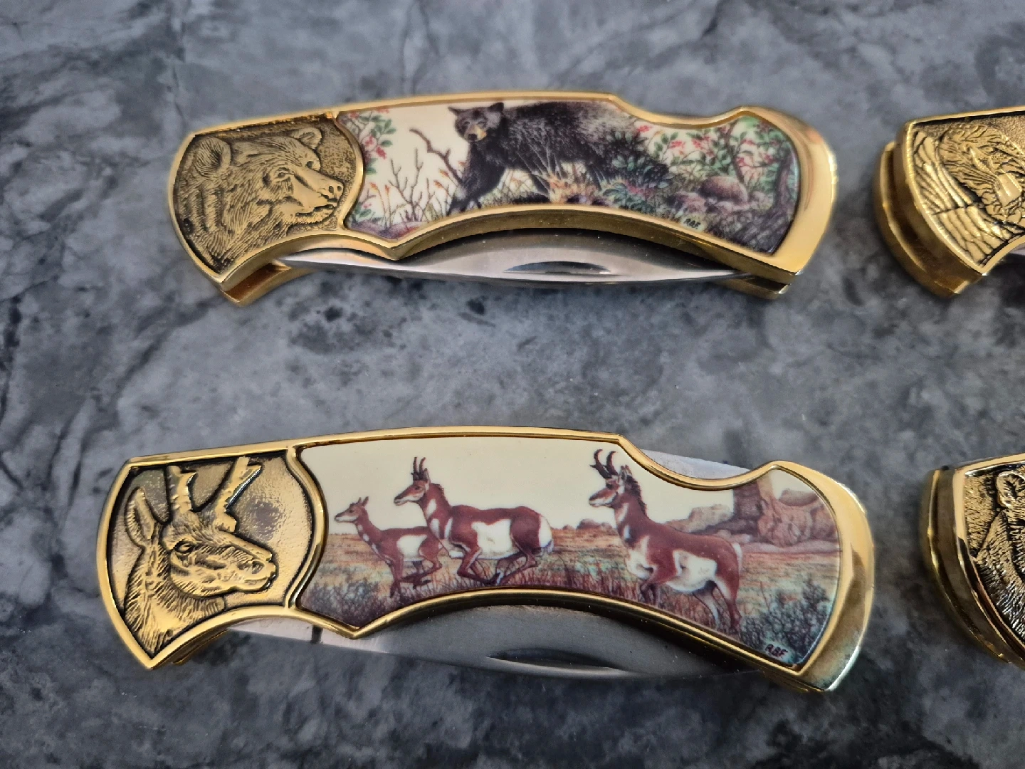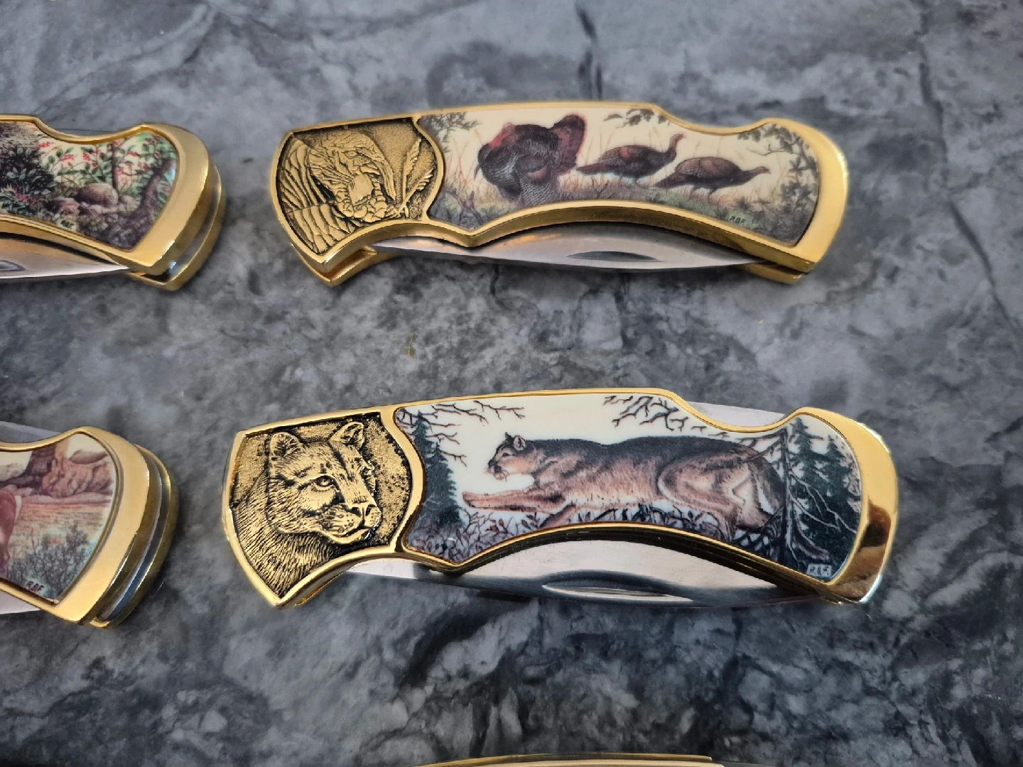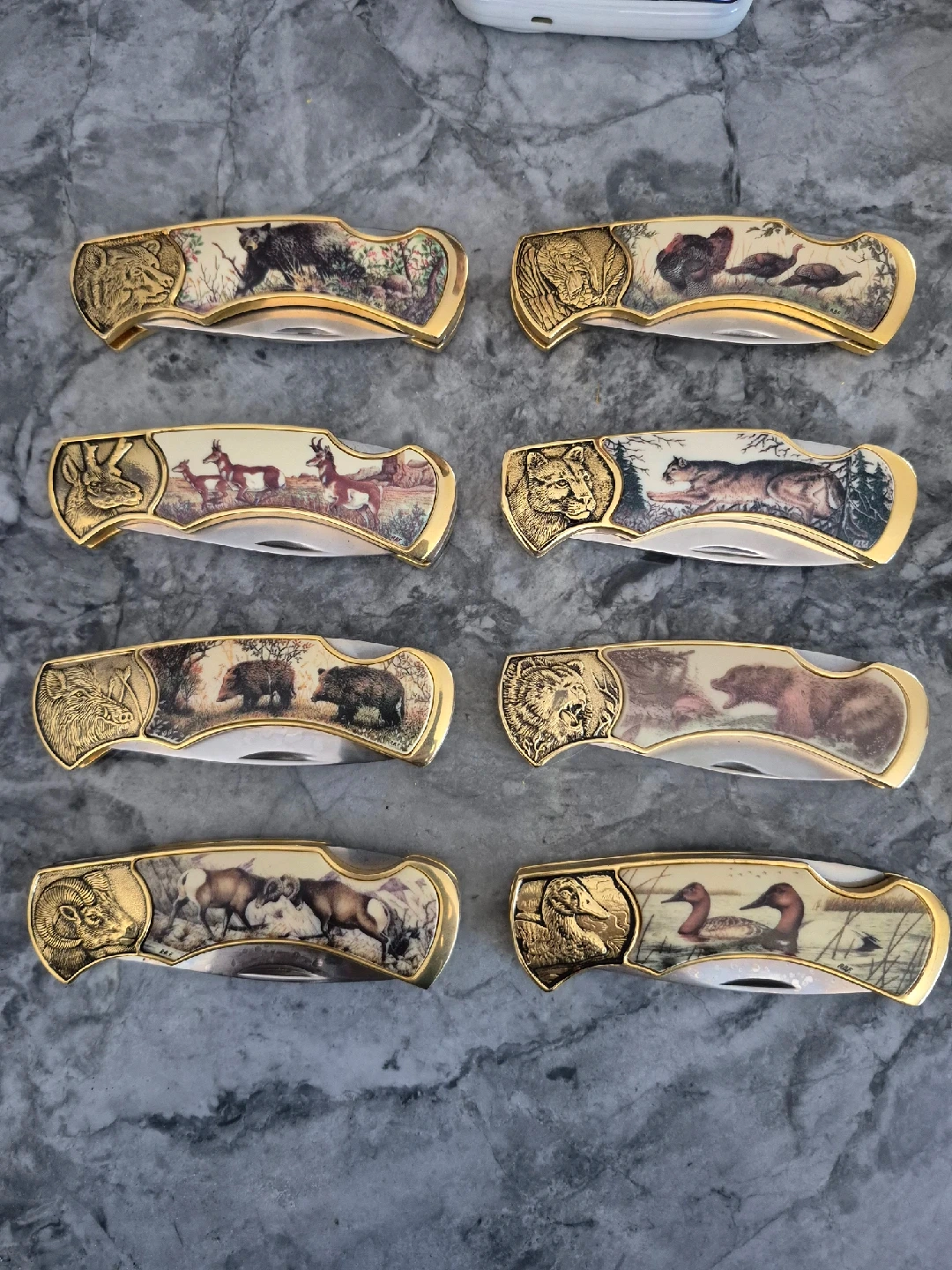 87Selling a collection of pocket knives featuring various wildlife designs. Each knife has a unique animal depiction on the handle, making them a cool addition to any collection or for everyday carry. Franklin mint retail for over 100 per knife. Price is perfect knife. Would take 200 for all 8.