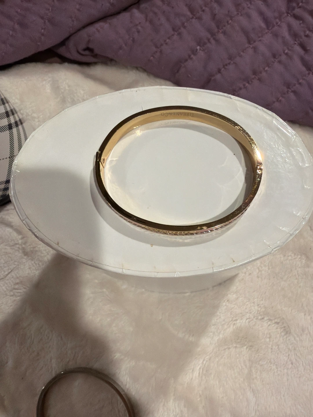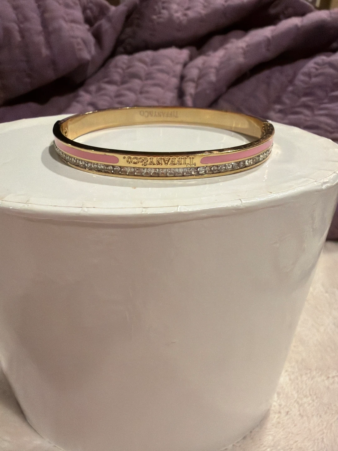 This is a Tiffany & Co. hinged real bangle bracelet. It features a gold-tone finish with a pink enamel inlay and clear crystal accents. The bracelet has the Tiffany & Co. logo engraved on the inside. It's a beautiful piece!