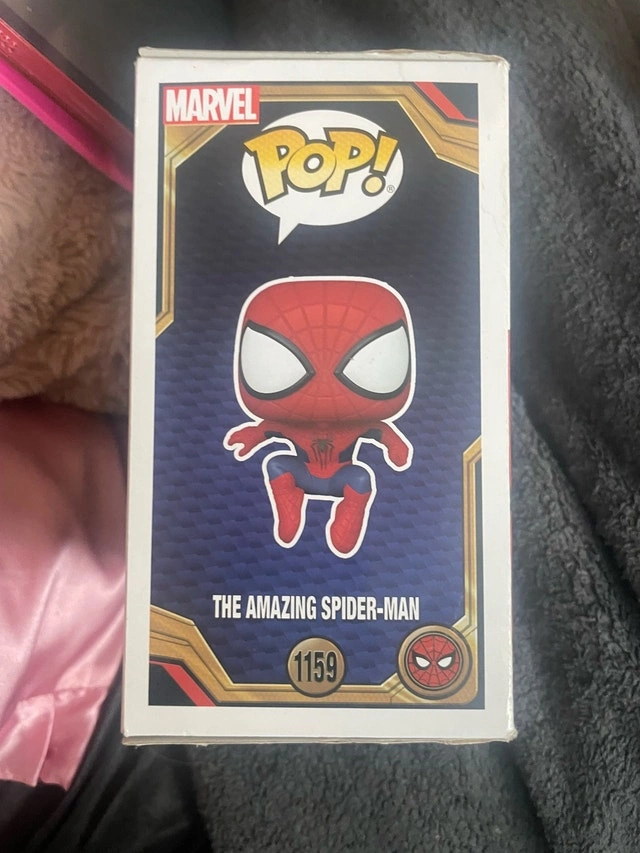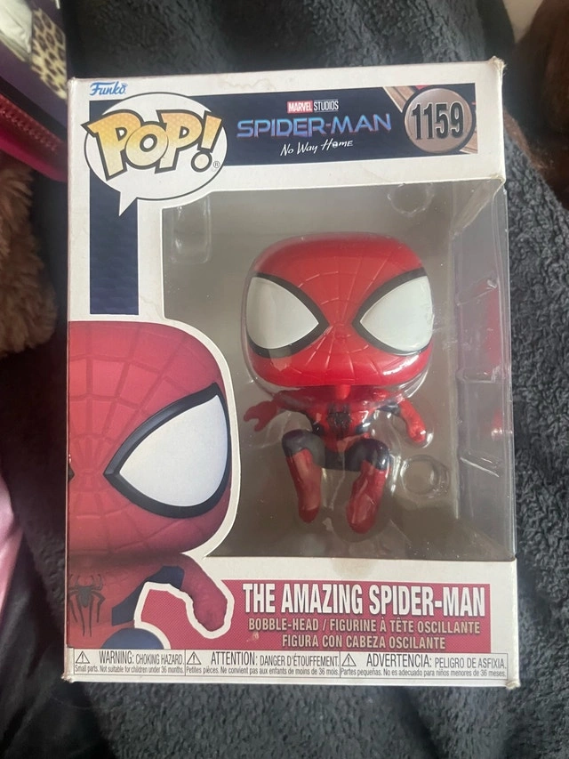 Selling a Funko Pop of The Amazing Spider-Man, #1159 from Spider-Man: No Way Home. This bobble-head figurine is a must-have for any Marvel or Spider-Man collector! The box shows signs of wear, which is reflected in the price. Cash accepted.