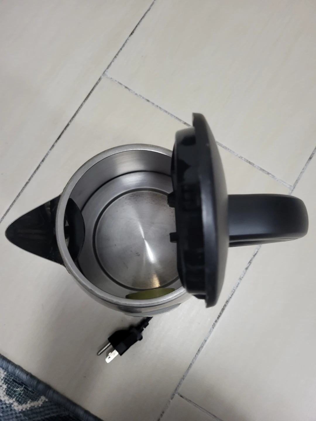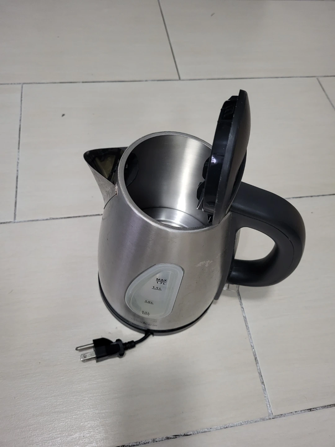 Sunbeam stainless steel electric kettle with a 1.7L maximum capacity. It has markings for 0.5L, 1.0L, and 1.5L. This kettle is great for quickly boiling water for tea or coffee.