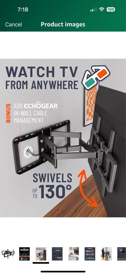 Full motion TV mount for 42 to 90 inch TVs (125lbs). Compatible with all major brands including LG, Sony, Vizio and Samsung. TV size range: 42” – 90”. Weight rating: 125 lbs. Swivel: 130º. Extension: 22". Profile from wall: 2.40". Tilt: 15º down, 5º up. Supported VESA patterns: 200 x 100 to 600 x 400. Post install leveling: +- 3º. Compatible stud width: 16” - 24”. Model: EGLF2.