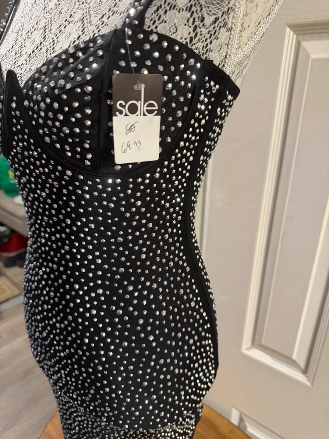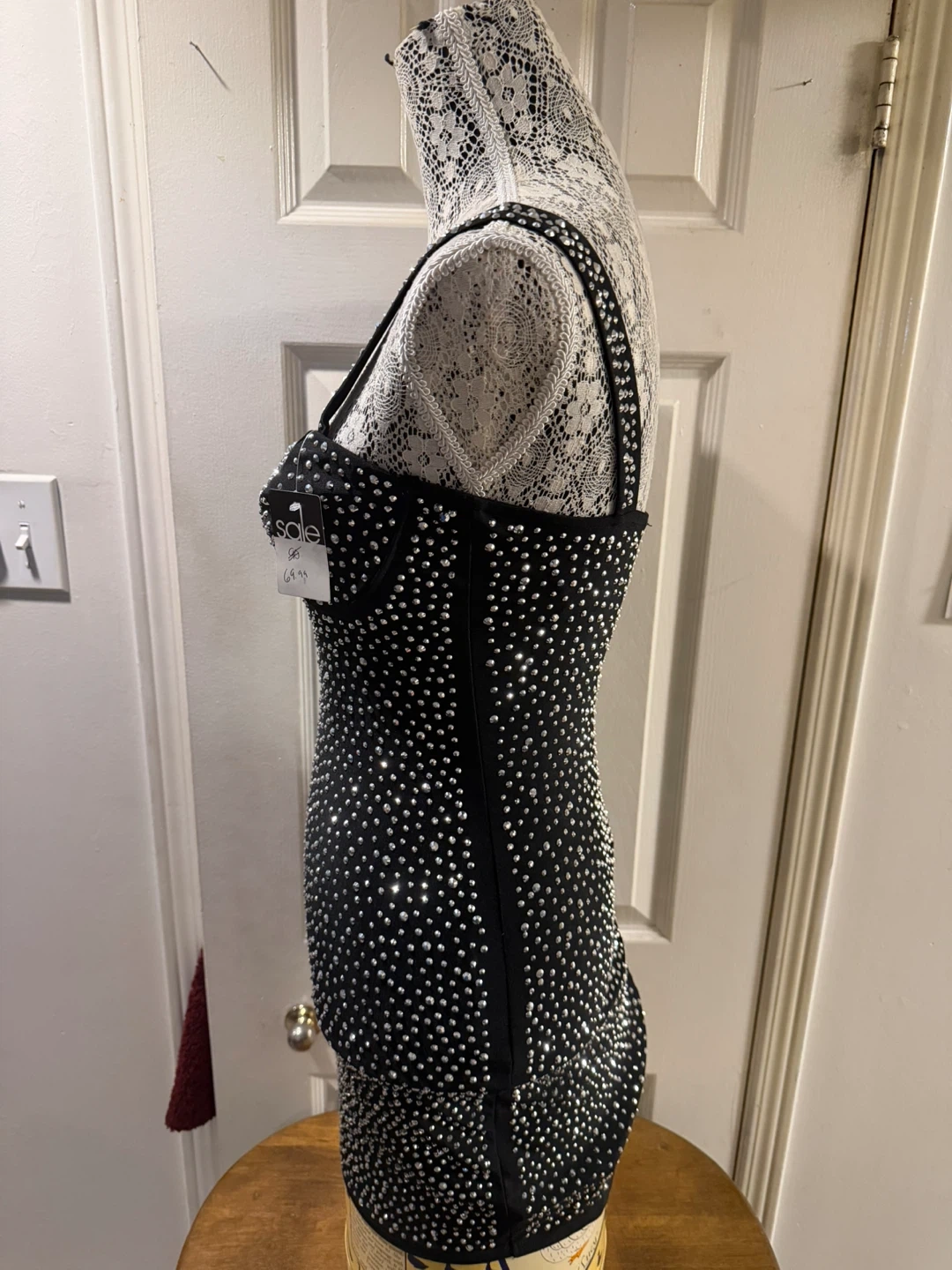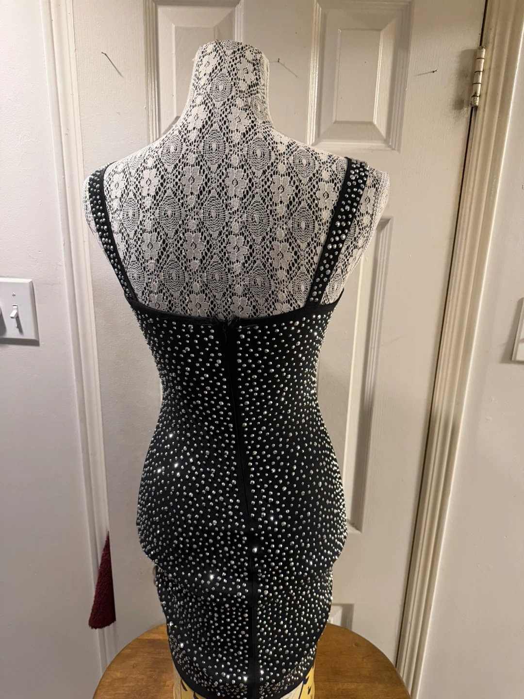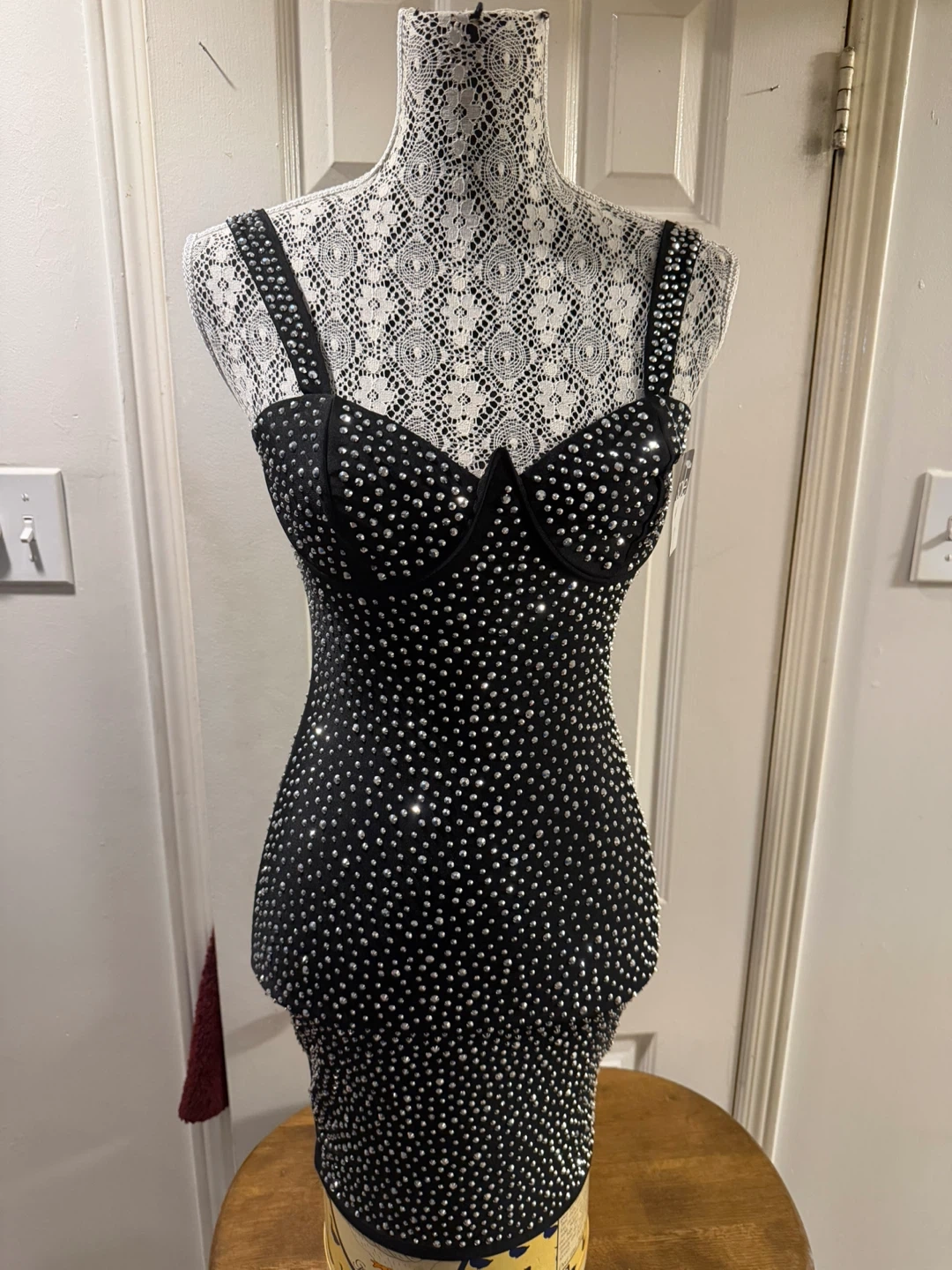 This black mini dress is covered in sparkling rhinestones! It's a statement piece perfect for a night out. The dress features a fitted silhouette with a zip closure at the back.