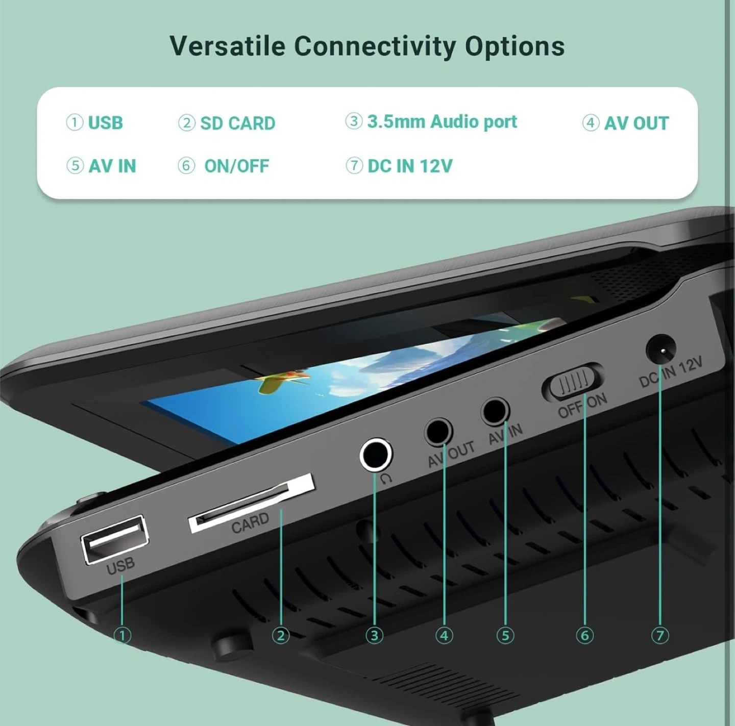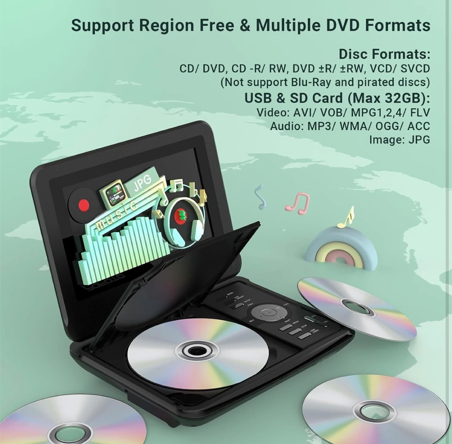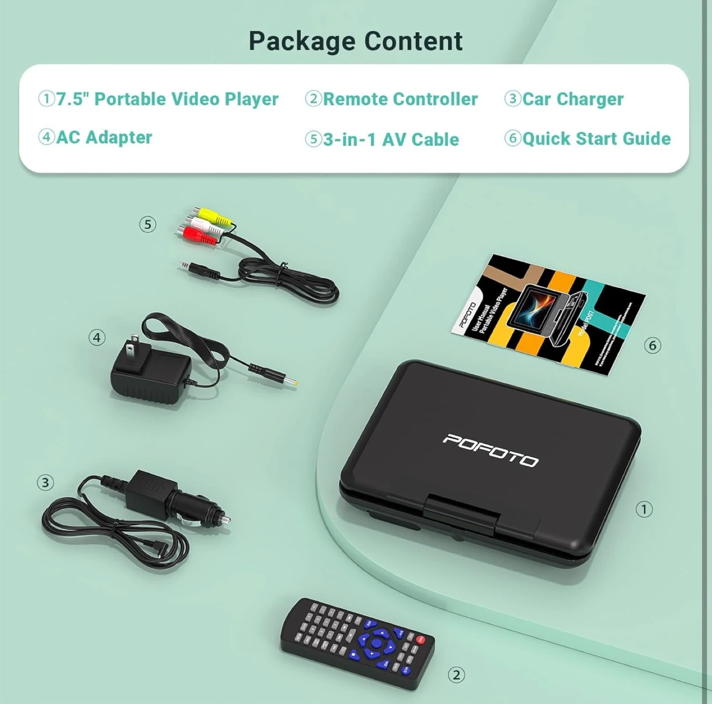 69Selling a POFOTO 7.5" portable DVD player in excellent condition! Key features: - Supports region-free DVDs and multiple formats (CD/DVD, CD -R/ RW, DVD ±R/ RW, VCD/ SVCD) - Supports USB & SD Card (Max 32GB) for video (AVI/ VOB/ MPG1,2,4/ FLV), audio (MP3/ WMA/ OGG/ ACC), and image (JPG) files - Has a last memory function to resume movies from where you left off Connectivity options include USB, SD card, 3.5mm audio port, AV out, AV in, and DC in 12V Package includes: - 7.5" Portable Video Player - Remote Controller - Car Charger - AC Adapter - 3-in-1 AV Cable - Quick Start Guide