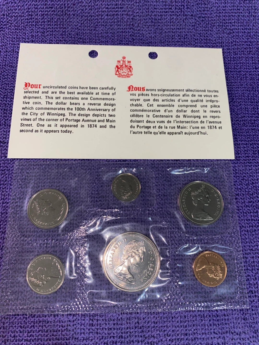 This set contains uncirculated coins, including one commemorative dollar celebrating the 100th Anniversary of the City of Winnipeg. The dollar coin features a reverse design with two views of the corner of Portage Avenue and Main Street, as it appeared in 1874 and today. These are uncirculated coins selected and available at time of shipment. This coin set is perfect for collectors of Canadian numismatics or those interested in Winnipeg's history.