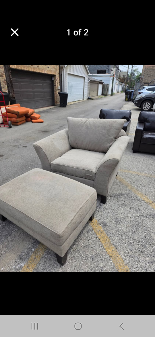 Comfortable down accent chair and matching ottoman. Upholstered in a durable, light gray fabric. this chair and a half has wooden legs provide sturdy support, but one needs reached.