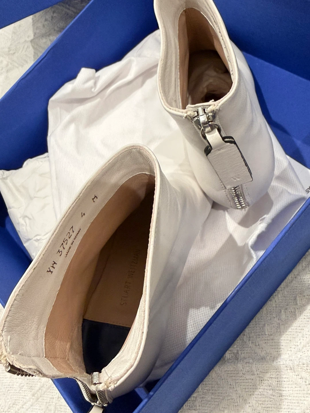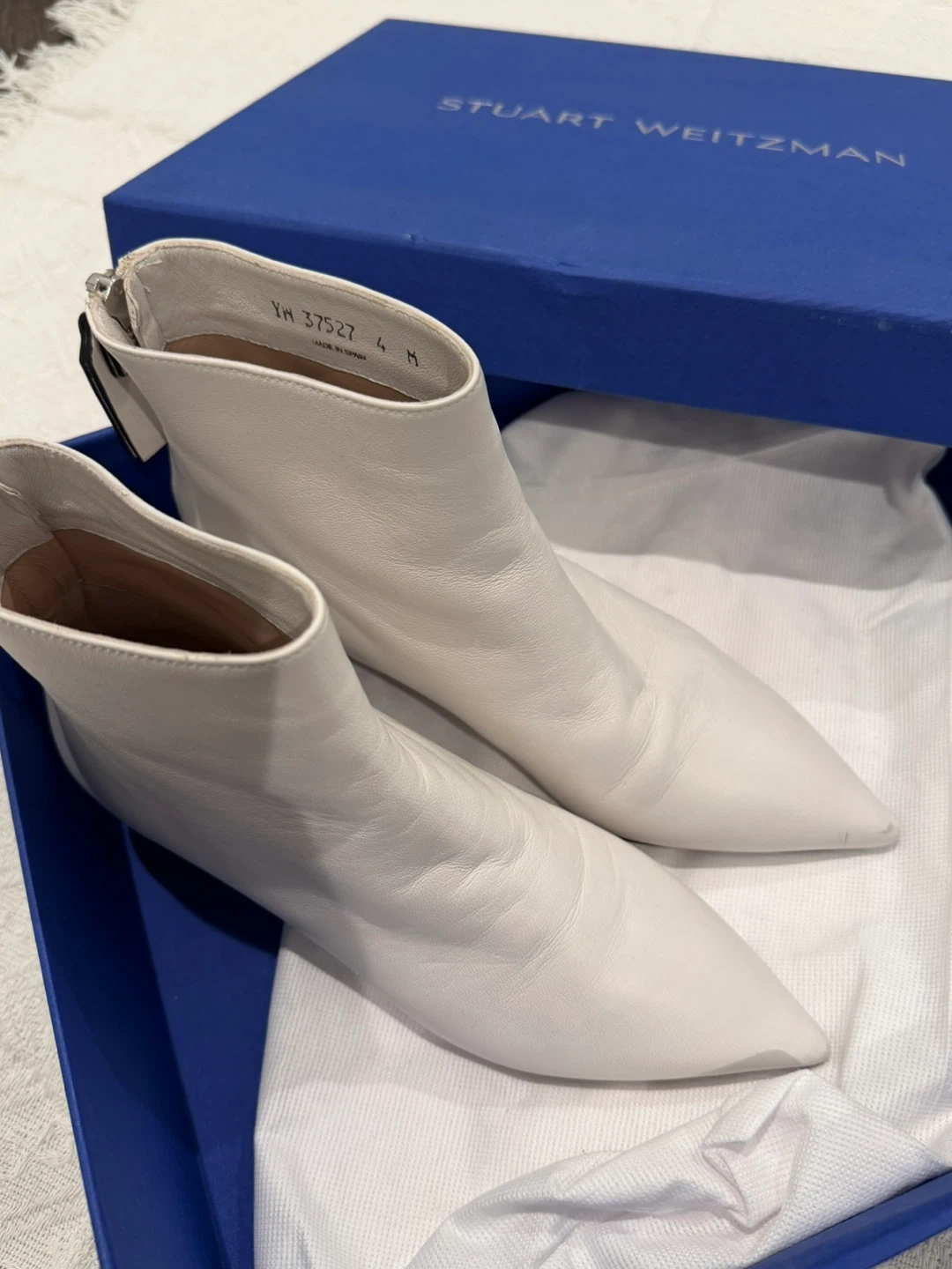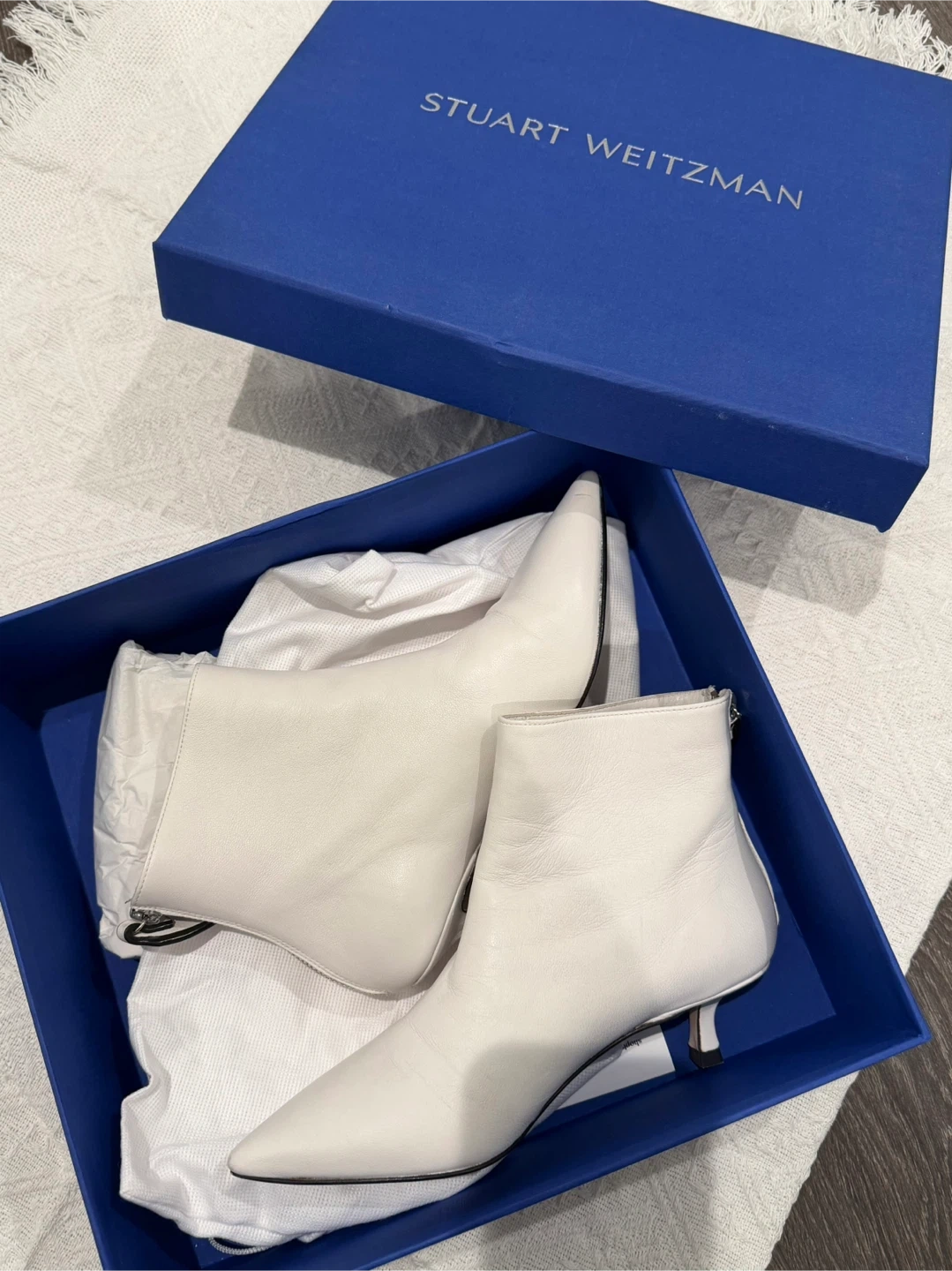 Selling a pair of Stuart Weitzman Kitten Hills booties in size 4. They are a lovely white leather and come with the original box!