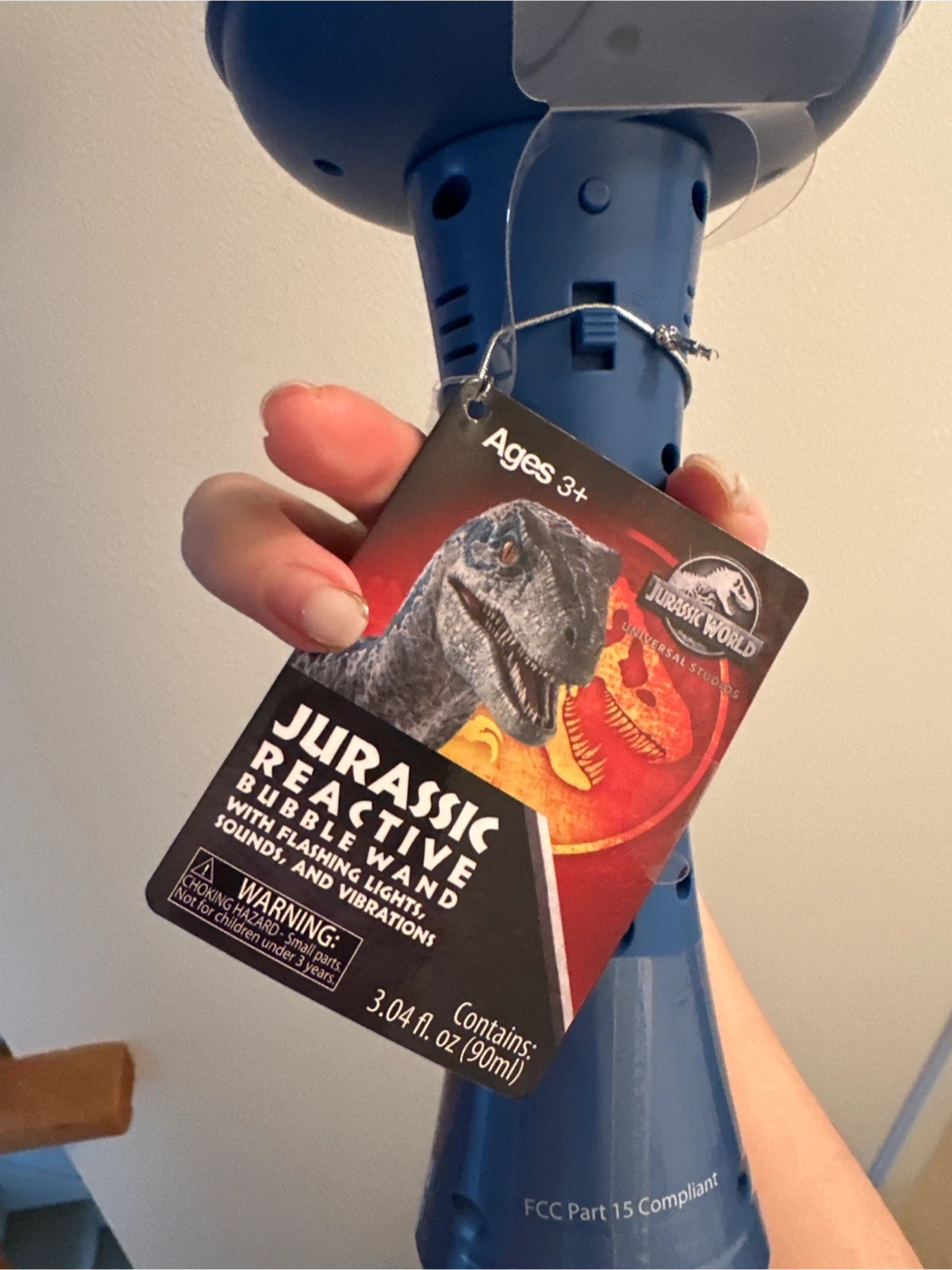 This Jurassic World bubble wand is reactive with flashing lights, sounds, and vibrations. It contains 3.04 fl. oz. (90ml) of bubble solution. Recommended for ages 3 and up.