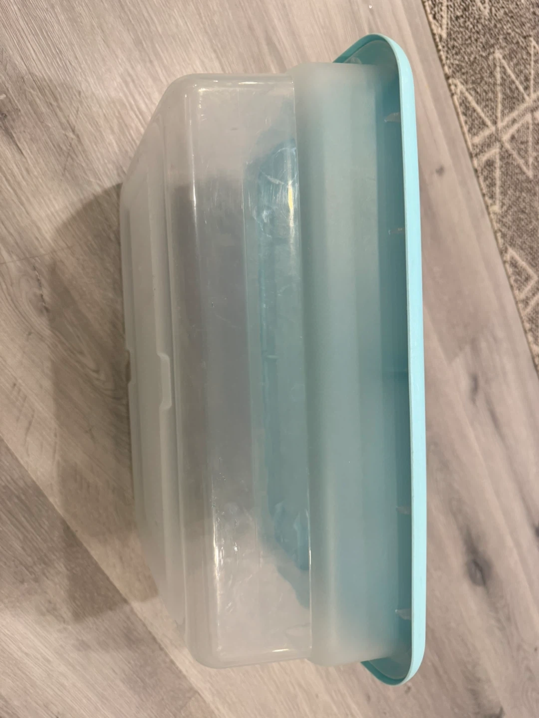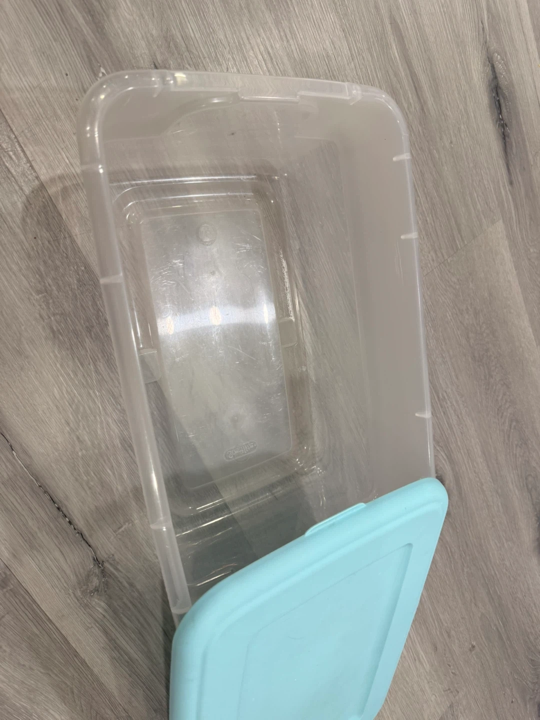 This is a Sterilite plastic storage bin with a light blue lid. It's made of clear plastic so you can see what's inside. Perfect for organizing your home!