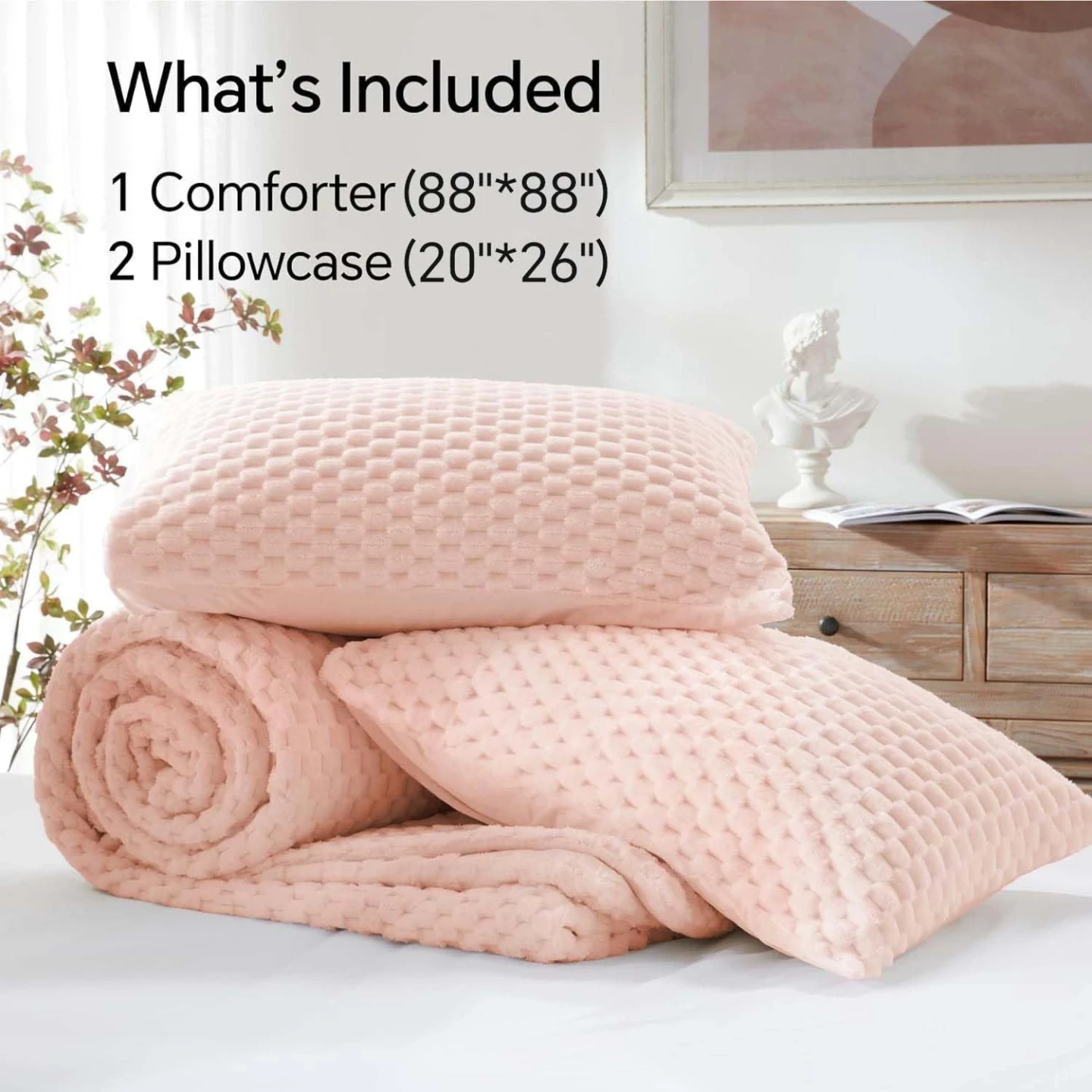 This 3D jacquard fuzzy flannel comforter set comes in a lovely pink colour. It's made for warmth and decor, offering a soft and breathable feel. The set includes one comforter (88"x88") and two pillowcases (20"x26"). It's also machine washable!