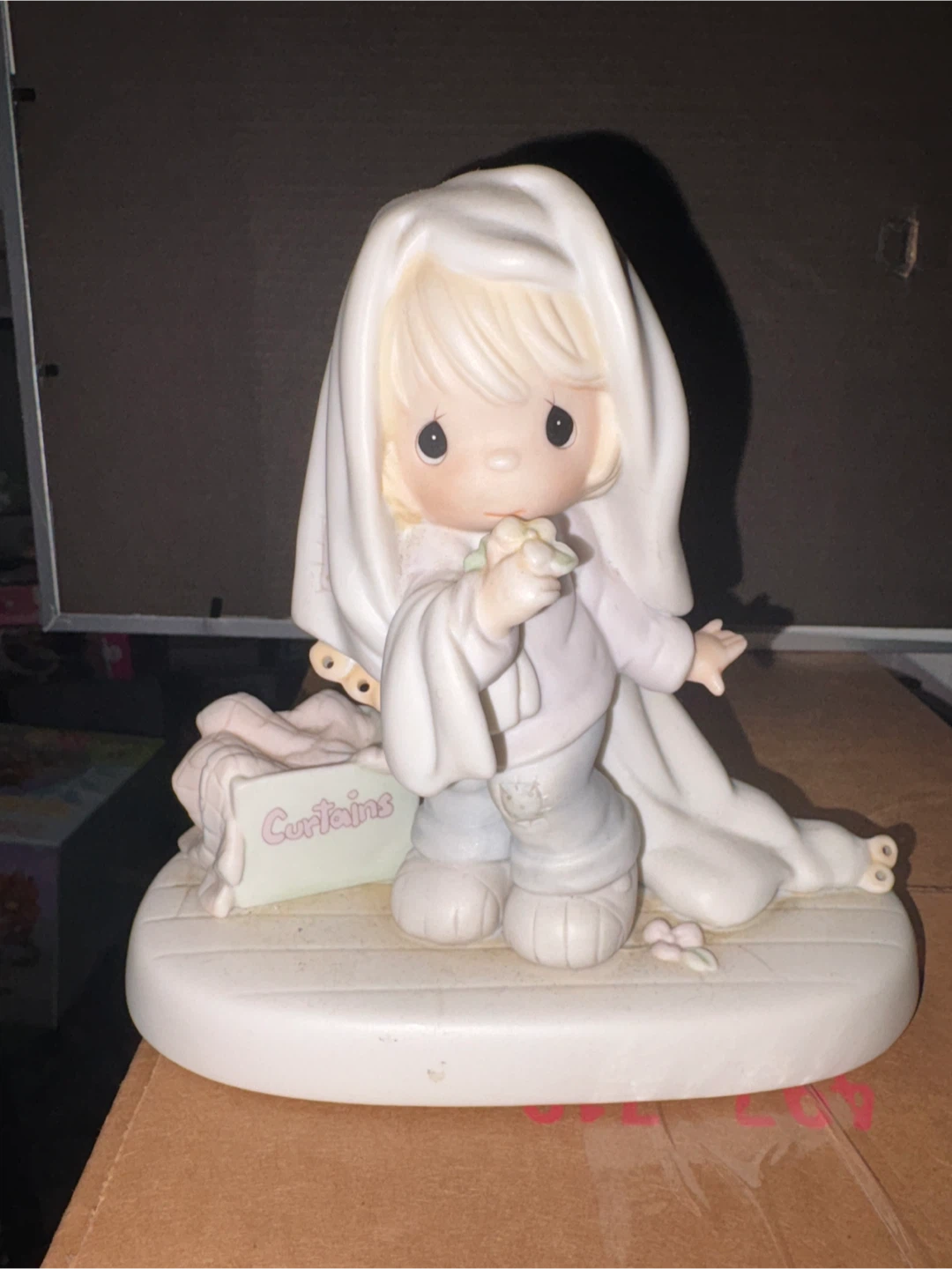 Selling a cute Precious Moments figurine. It features a child figure with a small sign that says 'Curtains'. It would be a sweet addition to any collection!