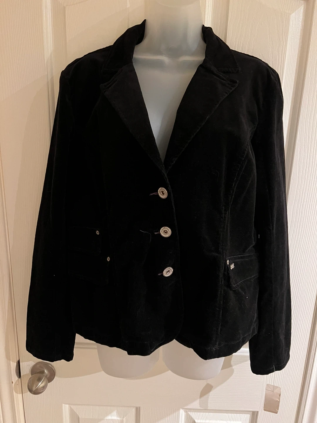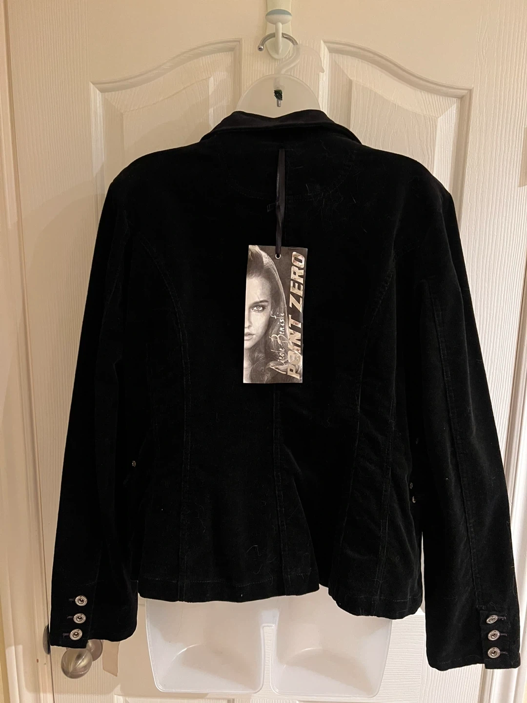 178Here's a stylish black velvet blazer from Point Zero! It's a size XL and made of 98% cotton and 2% spandex Tag says xl but fits more medium large