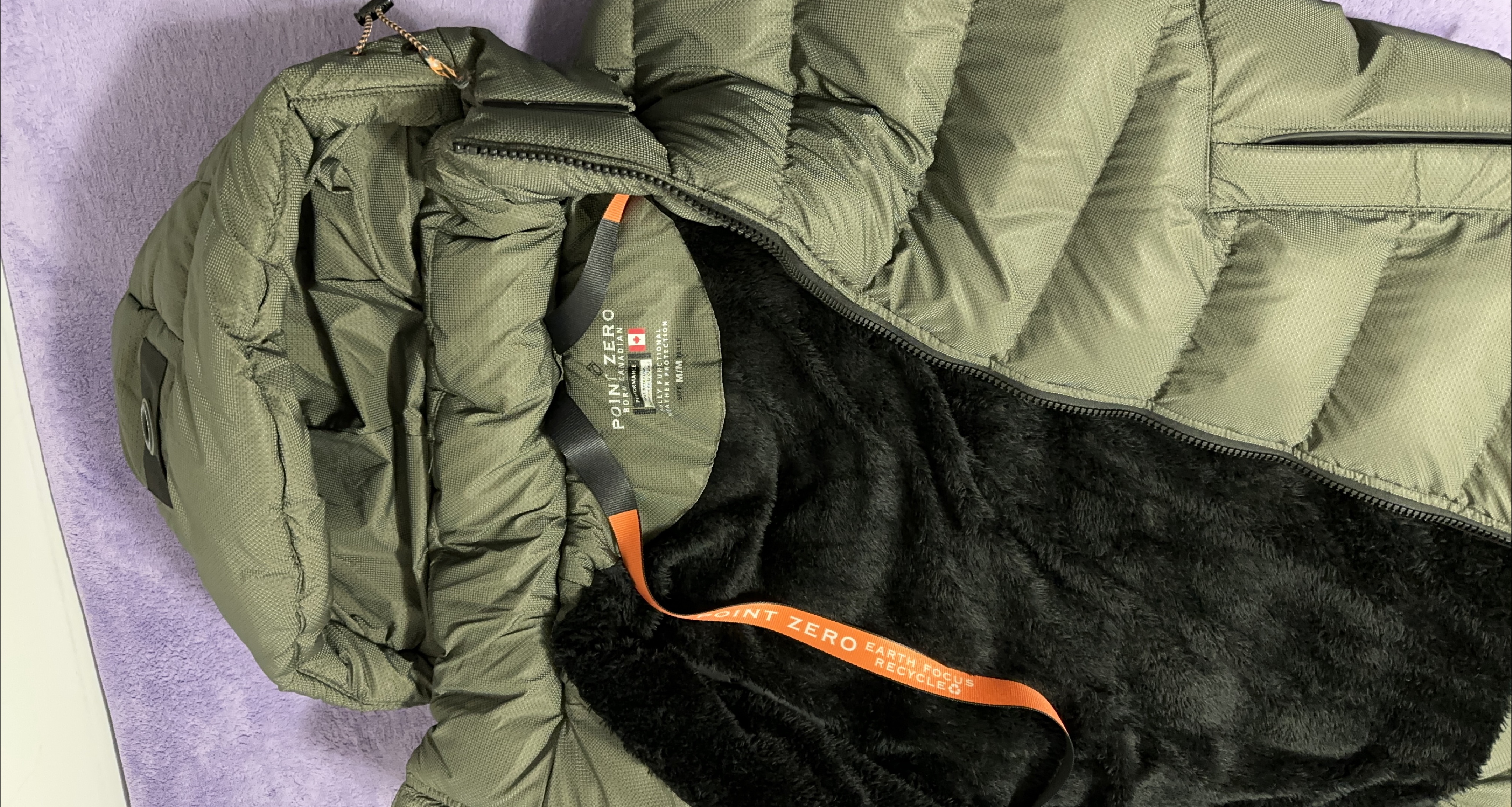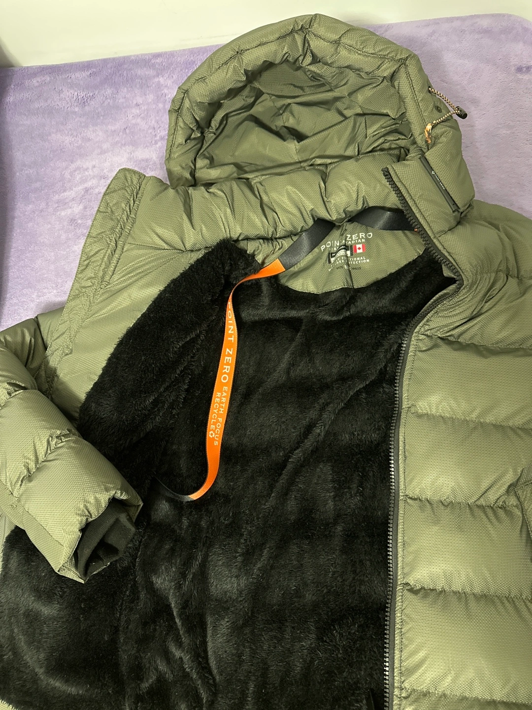 Selling a Point Zero puffer jacket with the Earth Focus Recycled design! It's in great condition and super warm, perfect for the Canadian weather. The jacket features a cozy black faux fur lining.
