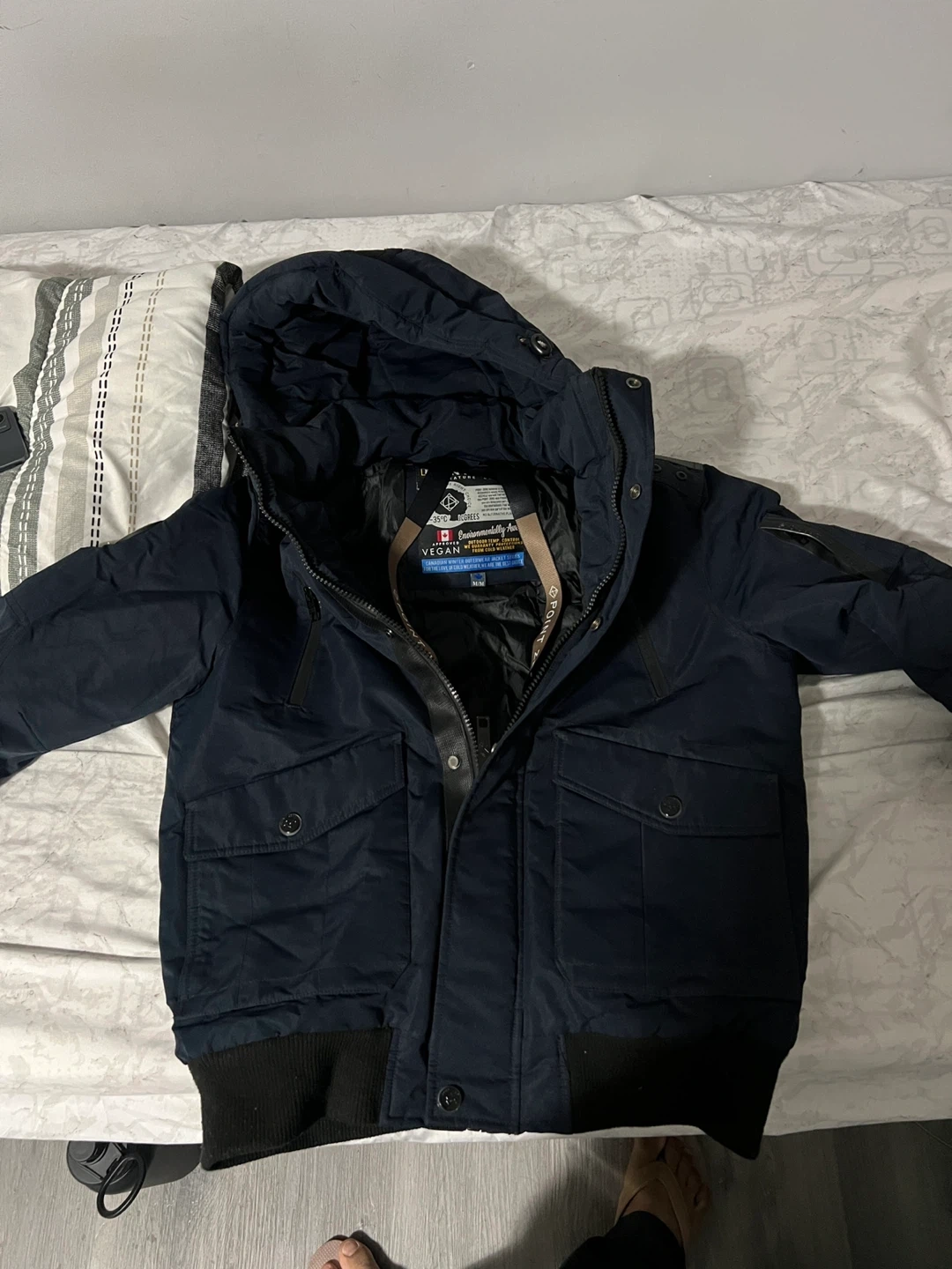5This Point Zero vegan down jacket is in great condition and ready for a new home! It's a stylish and warm jacket, perfect for the Canadian weather. The jacket is navy blue and features a hood for extra protection against the elements
