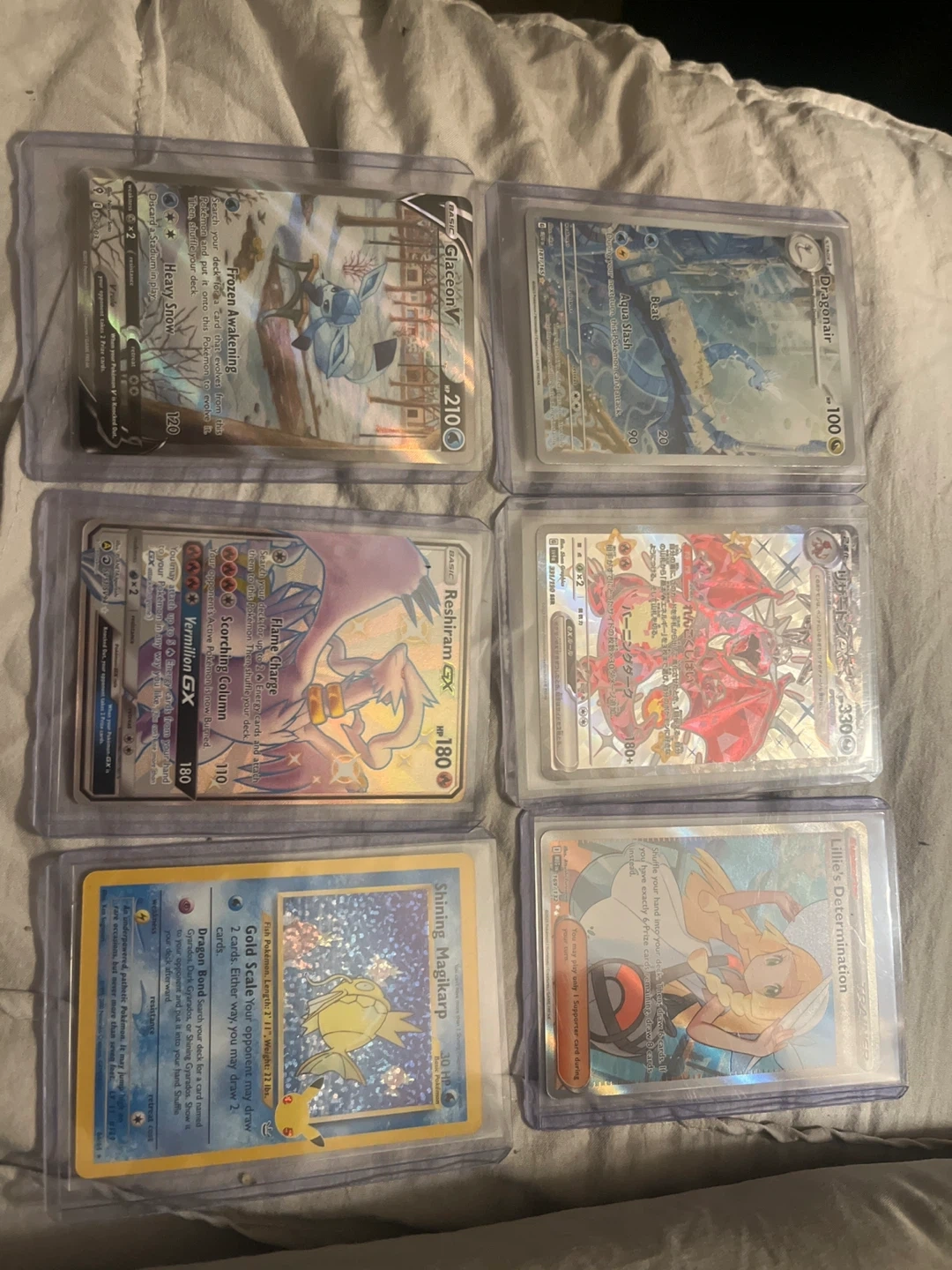 10Selling a variety of Pokémon cards including Glaceon V, Dragonair, Reshiram GX, Shining Magikarp, and Lillie's Determination! All cards are in sleeves for protection. Great for collectors or players!