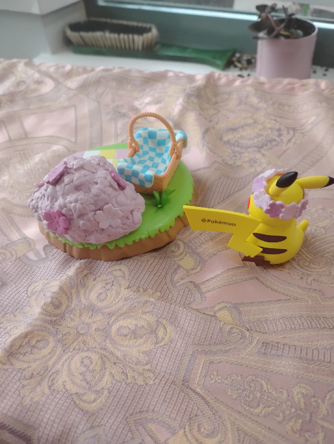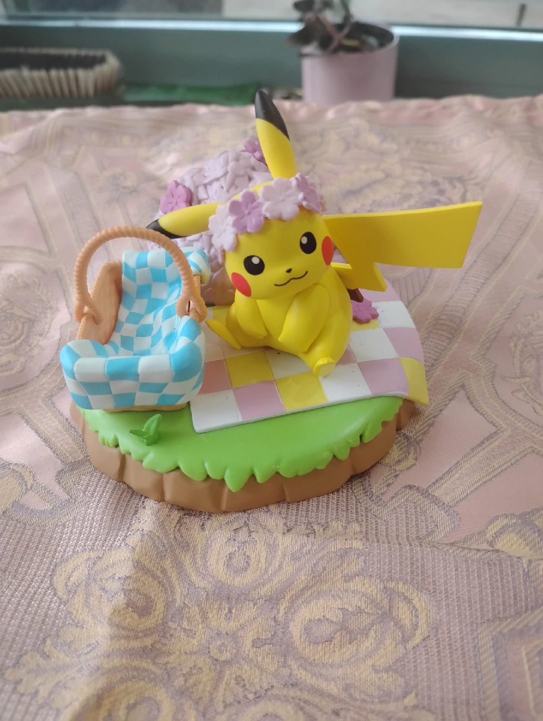 86Selling a cute Pikachu figure! It features Pikachu with a flower crown, sitting on a picnic blanket with a basket and a bush of flowers. It's a charming piece for any Pokémon fan's collection