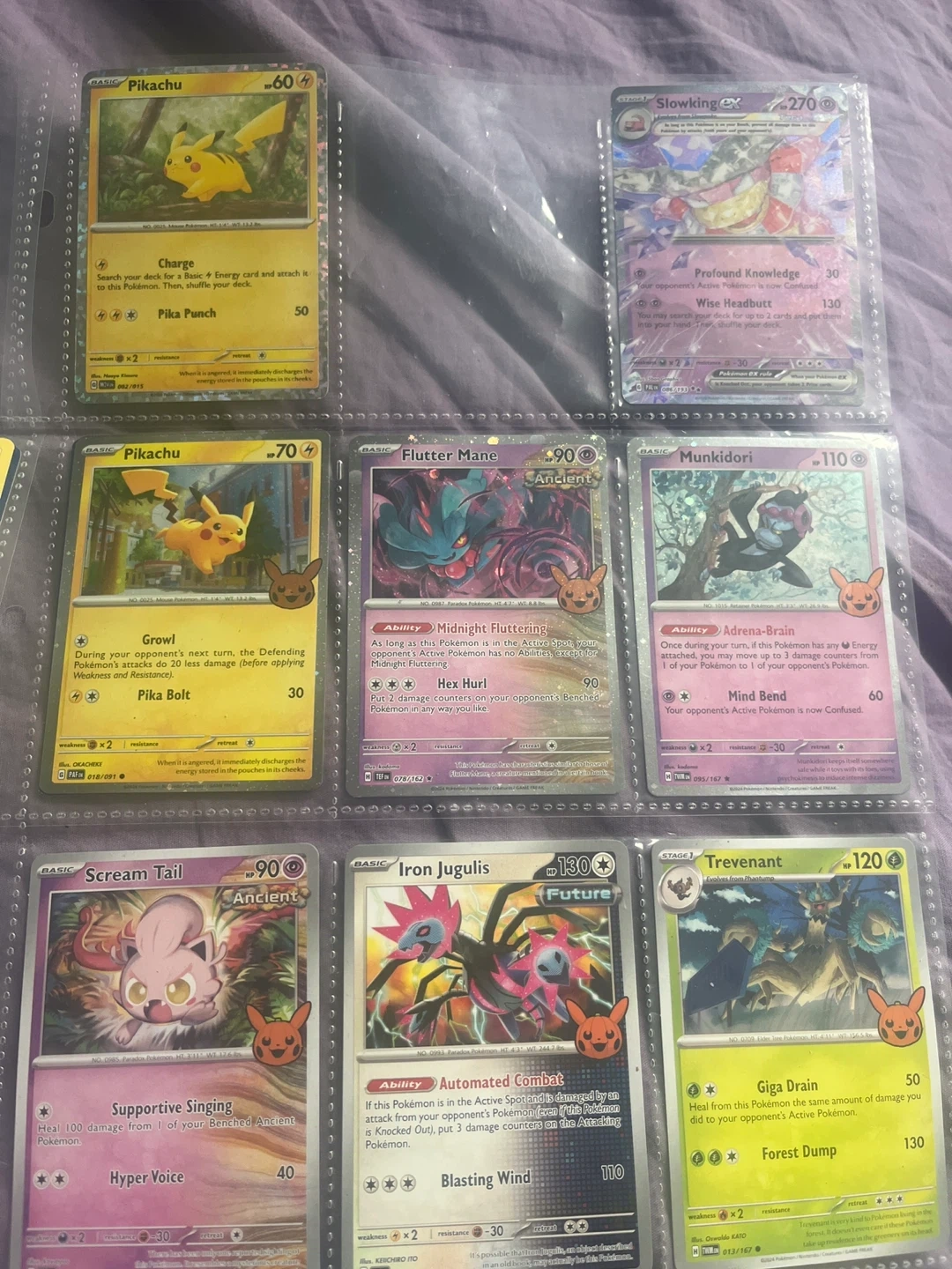 Selling a collection of Pokémon trading cards! Includes a variety of characters like Pikachu, Slowking, Flutter Mane, and more. Great for collectors or players looking to expand their deck! All cards are in good condition and ready for a new home