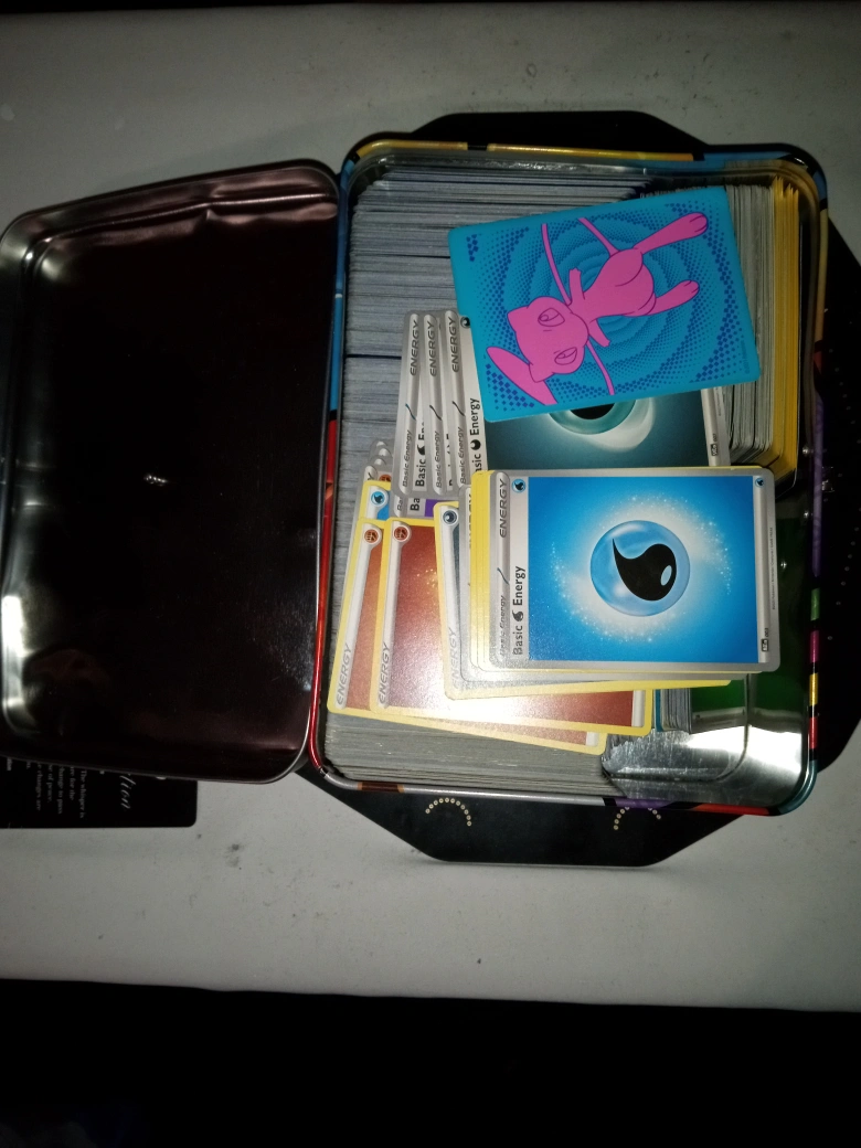 25Selling a Pokémon Trading Card Game tin filled with cards. The tin features Eevee on a colourful stained-glass style background. Great for any Pokémon card collector! hundreds of normal cards no rares.
