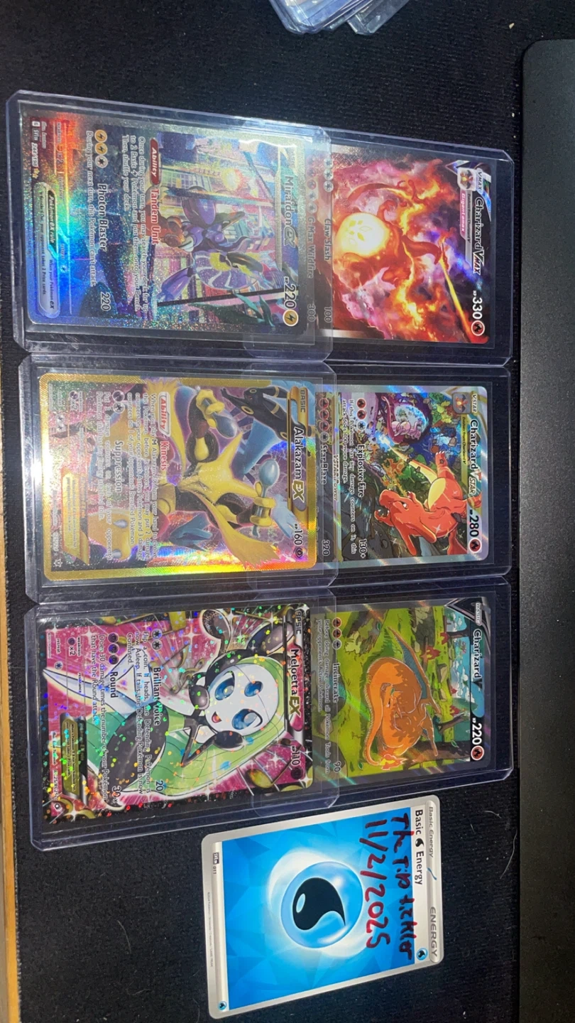 202Selling a collection of Pokémon trading cards! Includes some cool ones like Charizard VMAX, Charizard VSTAR, Miraidon EX, and Alakazam EX. Also includes basic energy cards with the date 11/2/2025 written on them.
