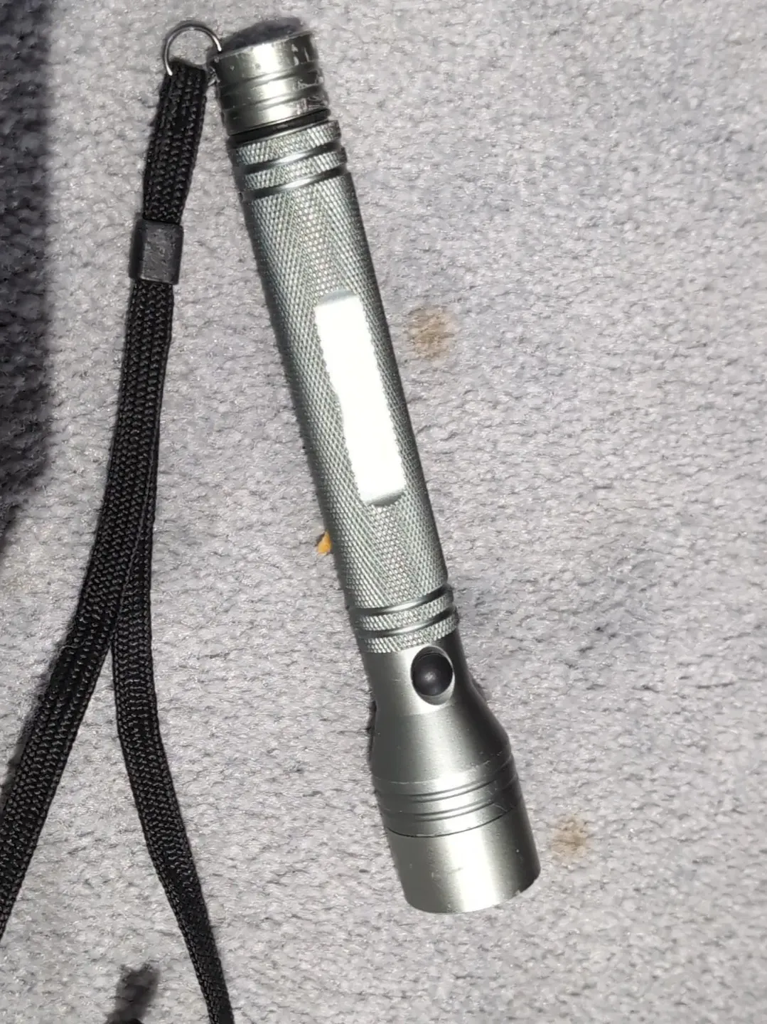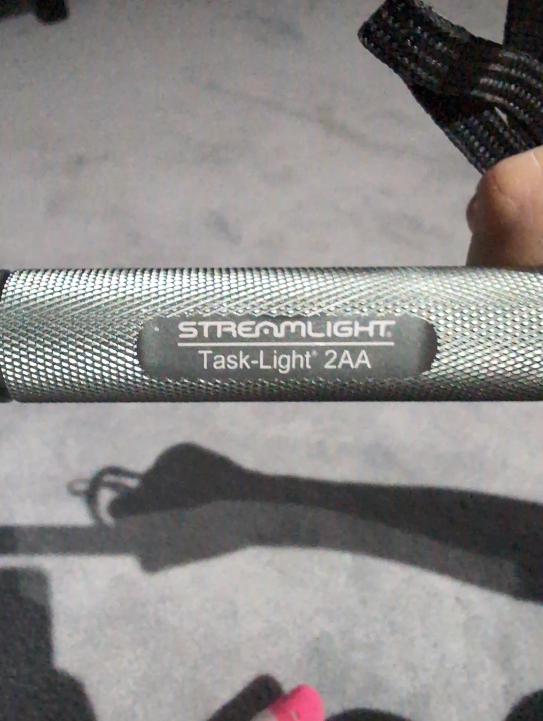 This is a Streamlight Task-Light 2AA flashlight. It's made of durable metal construction with a knurled grip. It uses 2 AA batteries.