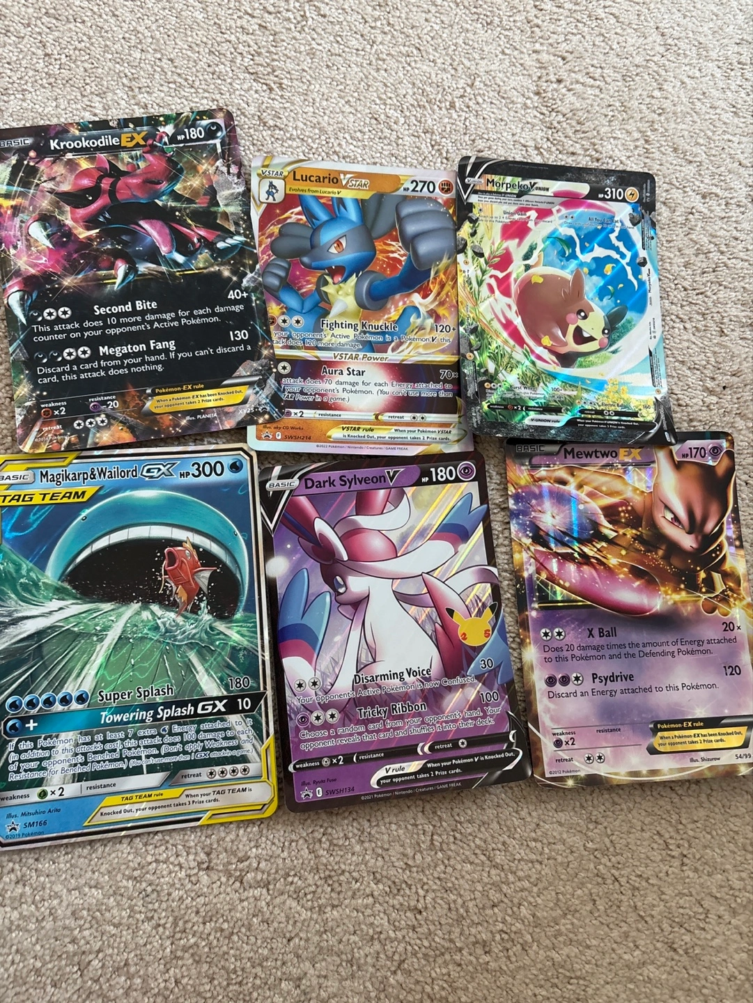 37Collection of six JUMBO Pokemon trading cards. Features various Pokemon including Krookodile, Lucario, Morpeko, Magikarp & Wailord, Dark Sylveon, and Mewtwo. Includes V and VSTAR cards. All mint condition, could be sold separately