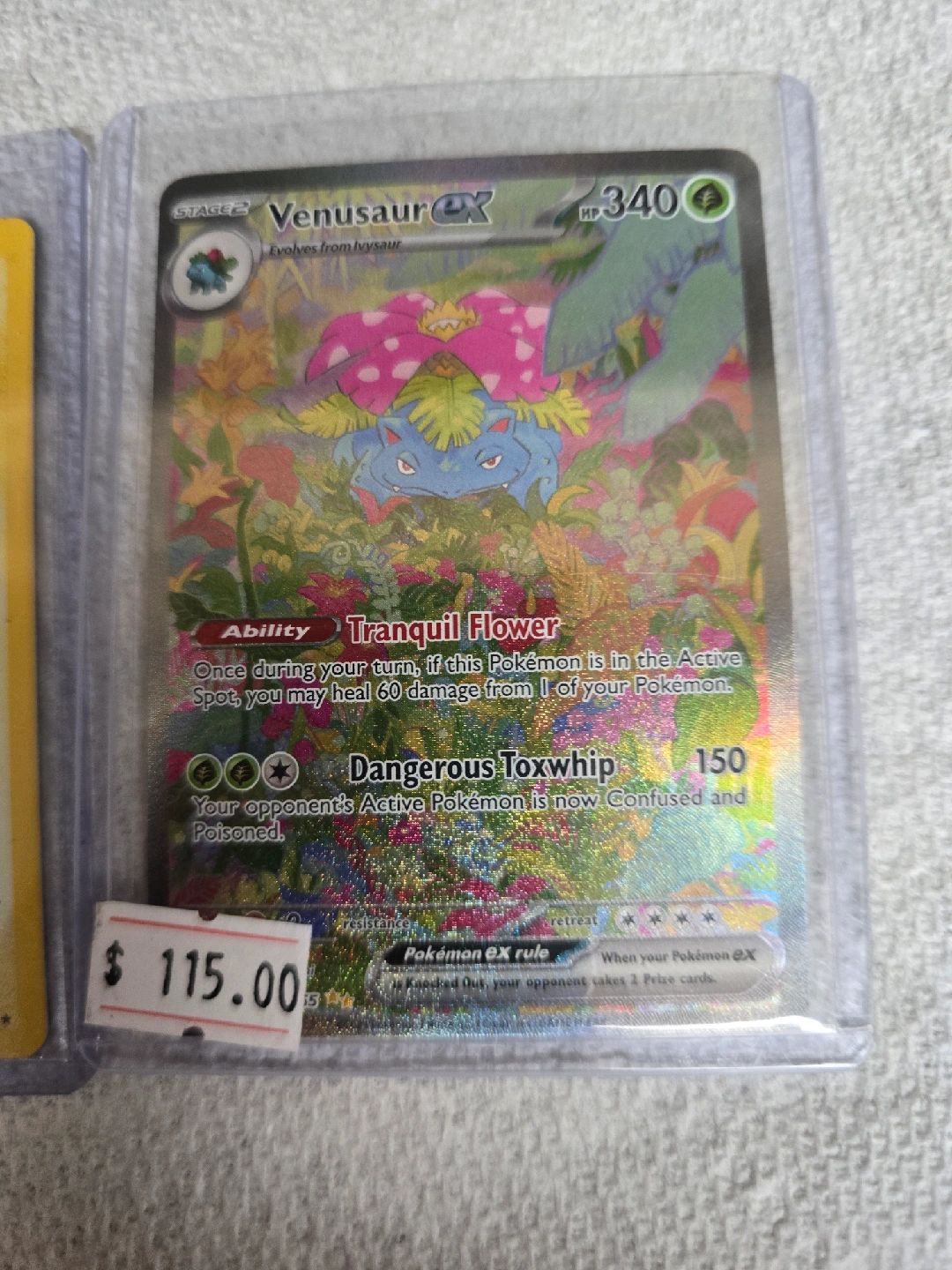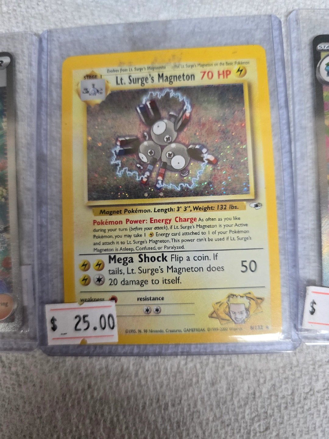 Selling a few Pokemon cards! - Erika's Invitation Trainer card - Lt. Surge's Magneton (70 HP) - Venusaur EX (HP 340) All cards are in protective cases.