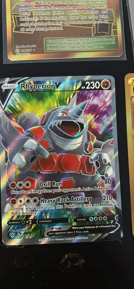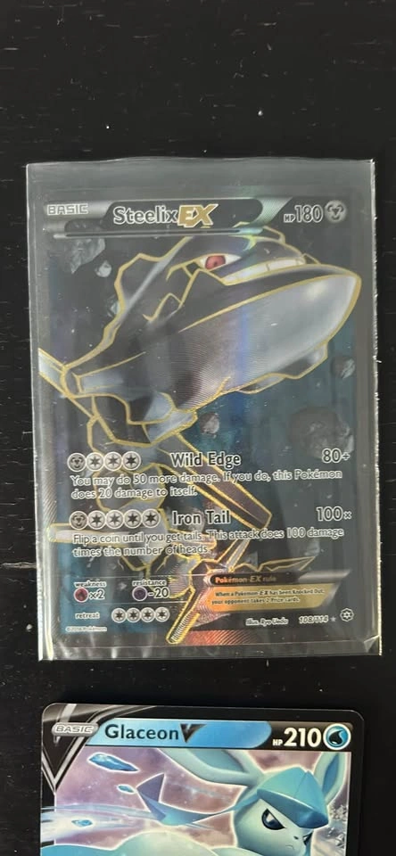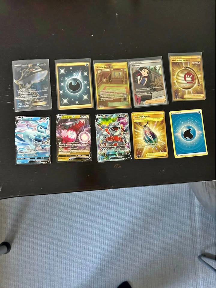 Dark energy secret rare $20 Steelix ex full art from 2016 $20 Martial arts dojo secret rare $10 Roxanne full art trainer $10 Welcoming lantern secret rare, Glaceon V, regidrago V Rhyperior V full art, Memory capsule secret rare, full art water energy are all 5 bucks each $60 FOR ALL NO TRADES