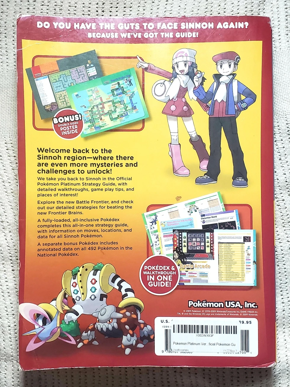 The Pokemon Platinum Version Official Game Guide is a comprehensive strategy book for the Nintendo DS video game. Published by Random House Information Group in 2009, this illustrated paperback guide includes 624 pages of in-depth tips and tricks for navigating through the Pokemon Platinum Version game. Authored by the Prima Games Staff, this officially licensed guide is perfect for young adults, ages 9-12, and adults looking to master the Pokemon world. With detailed insights and an engaging narrative, this guide offers a valuable companion for any Pokemon enthusiast. This is a well-used strategy guide. It is missing the first 8 pages (introduction) and has notable wear and tear on the edges. Please refer to photographs. Does not include any of the original posters. Having said that, the damage does not affect any of the chapters regarding gameplay. It's still an incredibly handy tool for anyone looking to 100 We accept Interact e-Transfer and PayPal, as well as cash. NO SHIPPING and NO DELIVERY. Curbside pickup ONLY. If you are interested in purchasing this product or have any further inquiries, please send us a direct message.