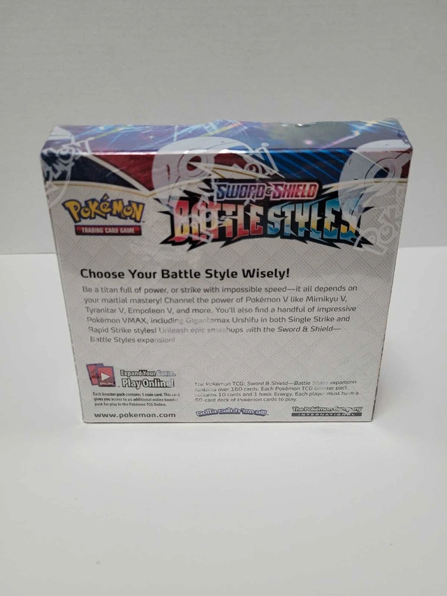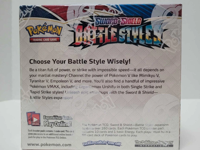 5NEW SEALED RARE ORIGINAL PRINT The Pokemon TCG Sword and Shield Battle Styles expansion contains over 160 cards. Each Pokemon TCG booster pack contains: 10 cards 1 basic Energy 1 code card. I will only reply and meet Sunday to Friday. I will do combo deals with my other listings, so check them out. Thanks!