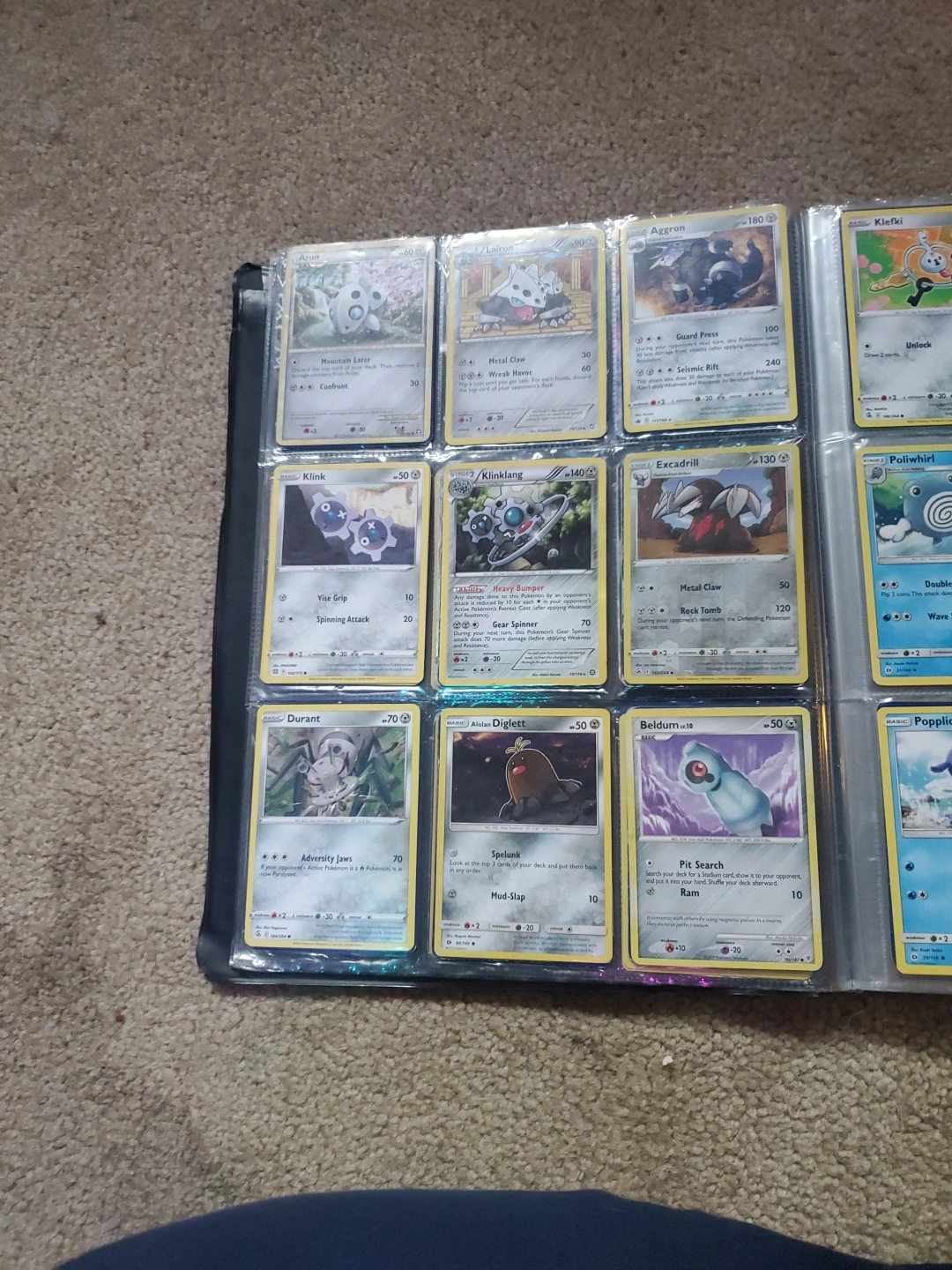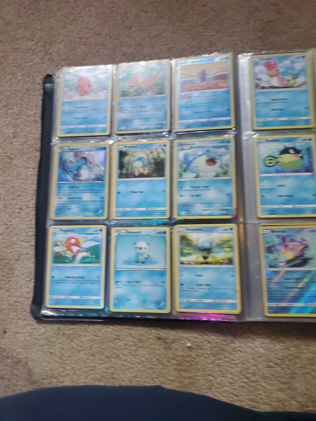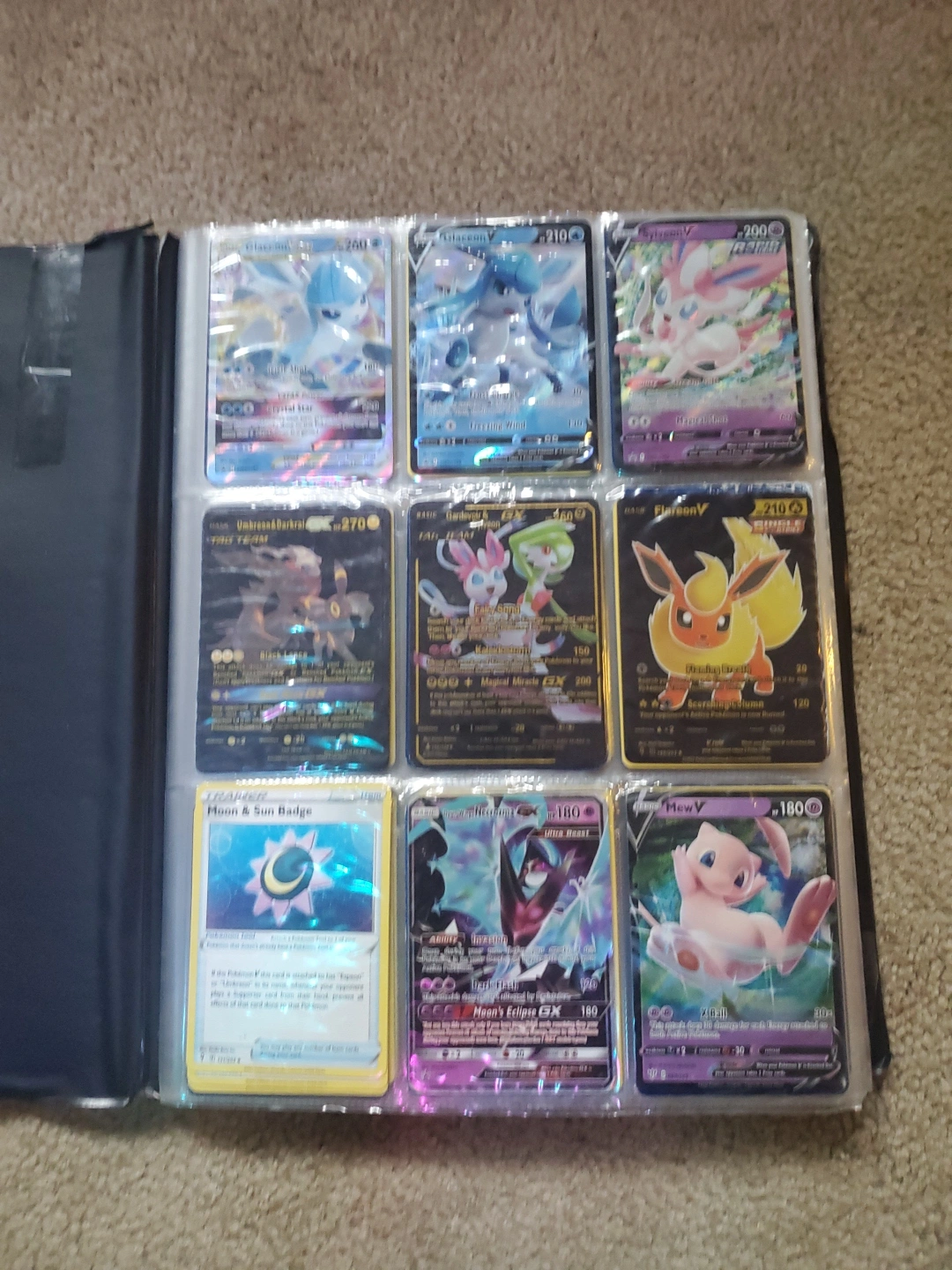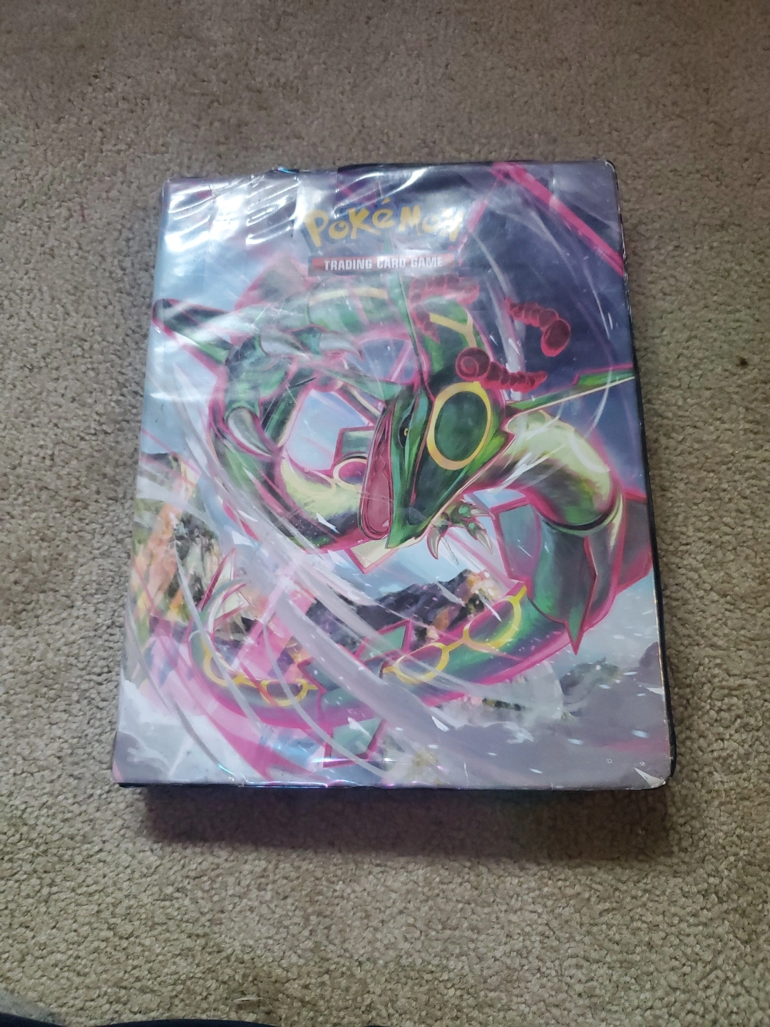 Selling a binder full of Pokemon trading cards! It includes a variety of cards, including some V and EX cards. The binder itself has a cool Rayquaza design on the cover. Great for any Pokemon card collector!