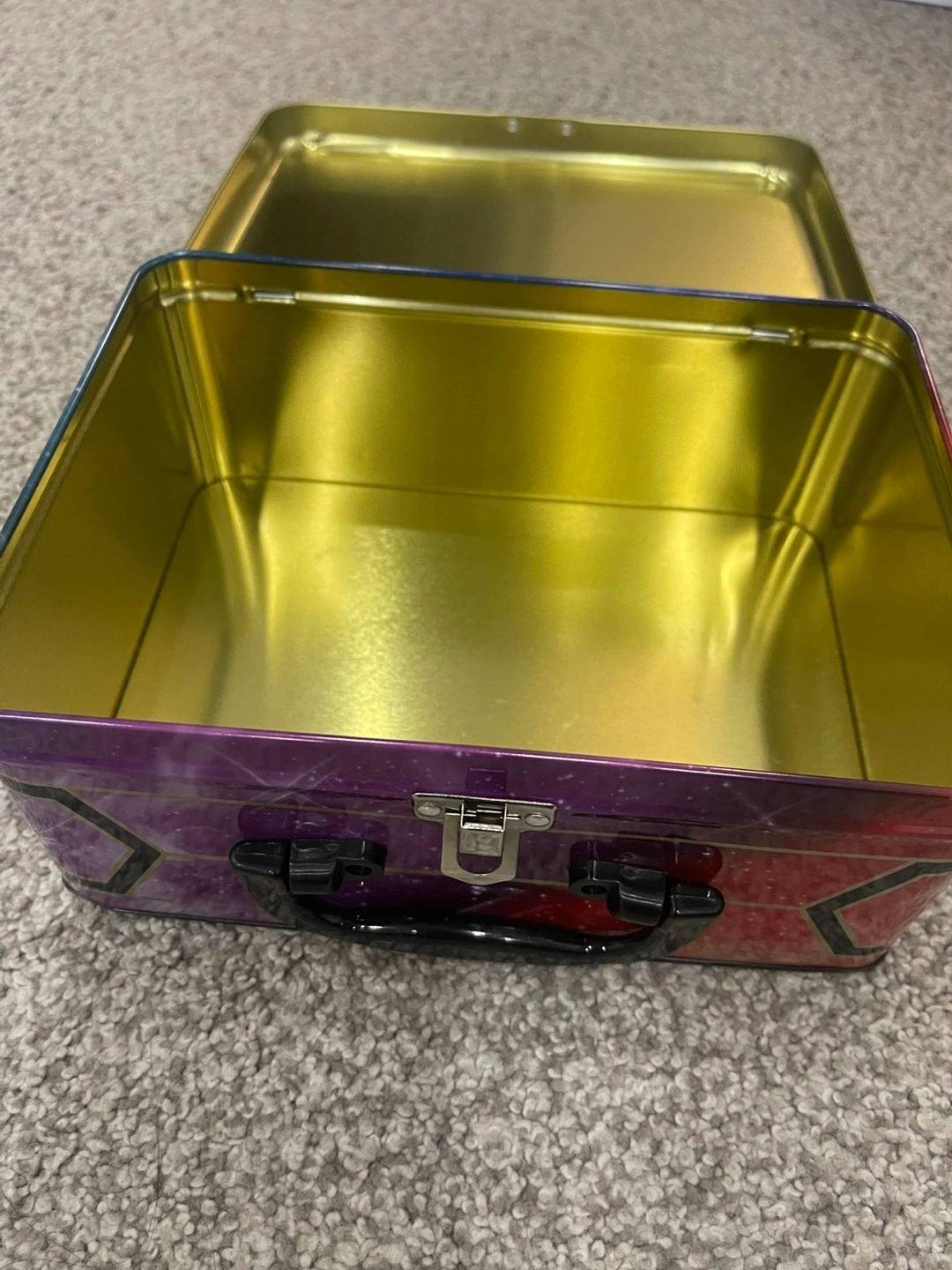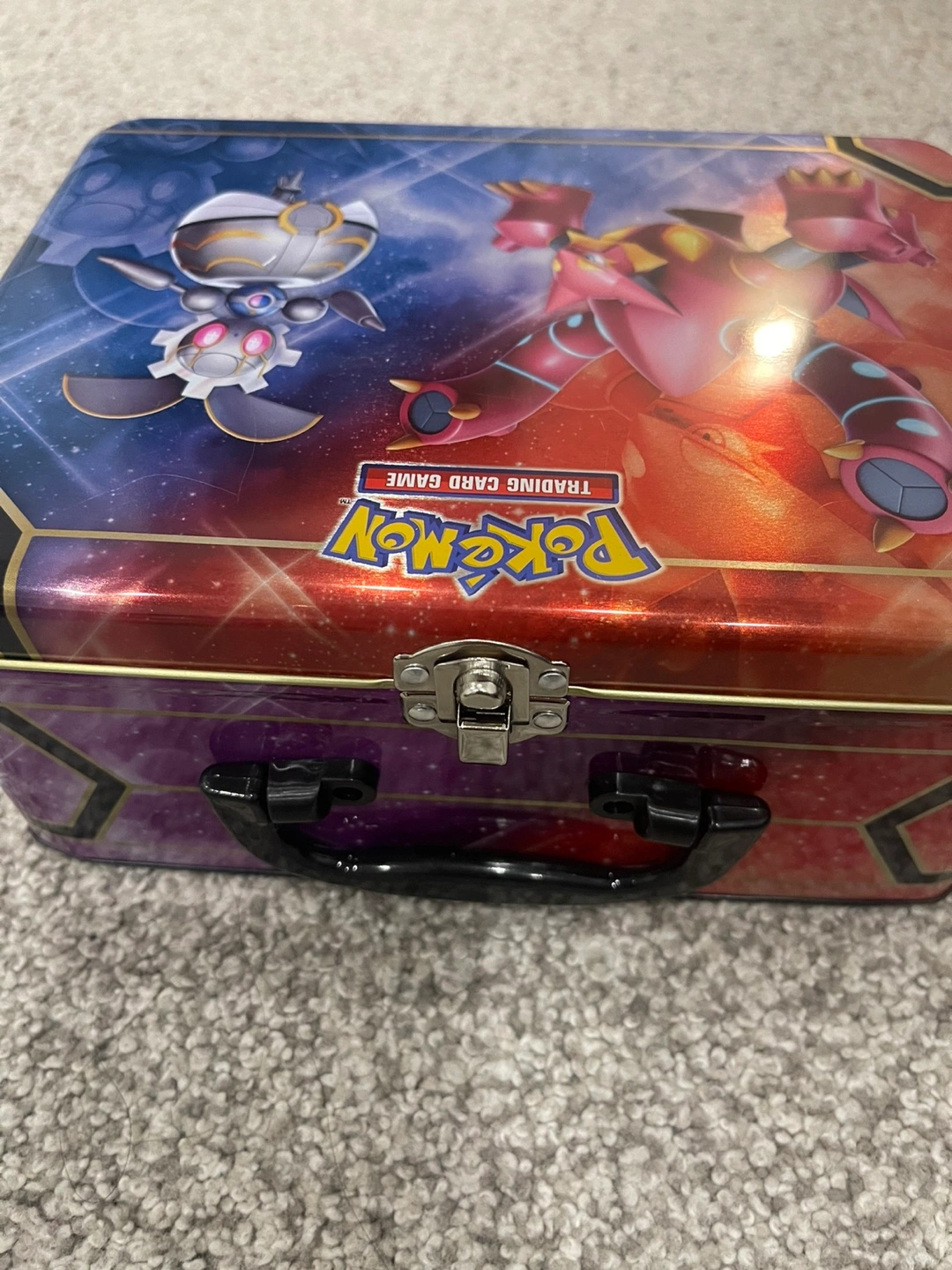 Empty Pokemon tin. Features Regidrago and Regieleki artwork. Great for storing cards or other small items. Metal construction. Includes carrying handle.