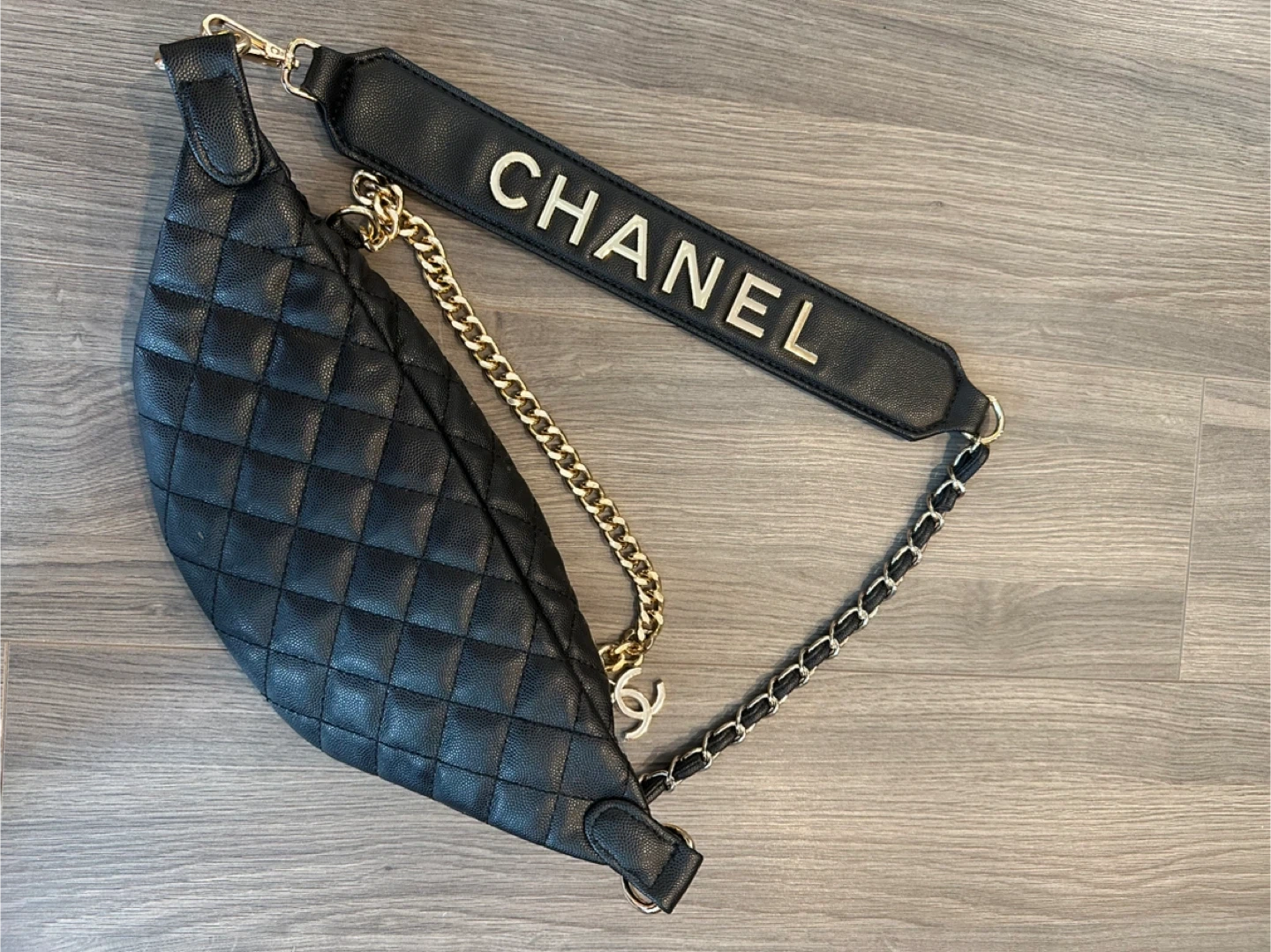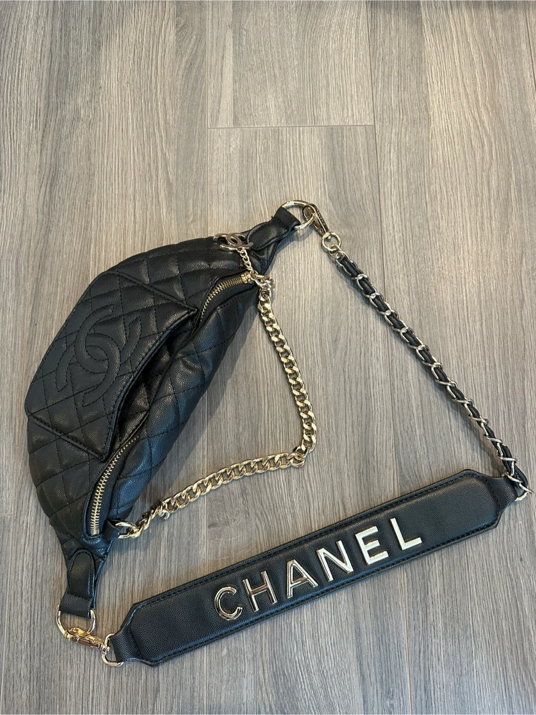 Black quilted faux leather belt bag with a "CHANEL" embossed strap and gold chain detailing. It's got zippered closures and an interior pocket. This bag's great for travel or everyday use!